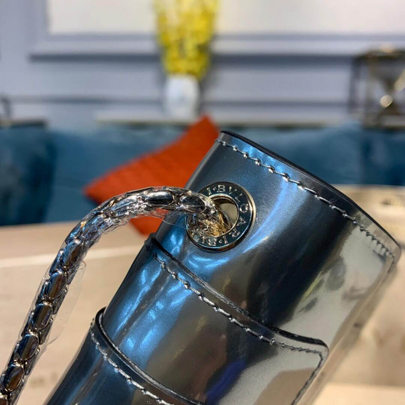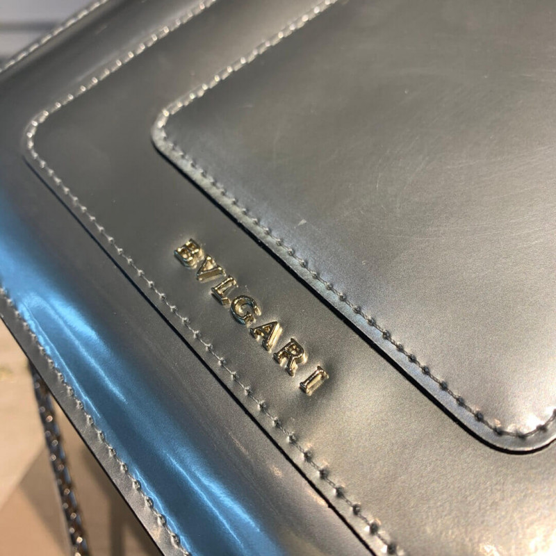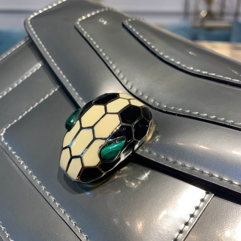 Flap takarózsák Serpenti örökre ezüstcsiszolt fém borjú bőrben. sárgaréz világos aranyozott kígyófej bezárása fekete -fehér zománcban, zöld malachit szemmel. Kis méret, egy kövér, zsebtükörrel és drága kígyótest alakú lánccal. Más színekben is kapható.