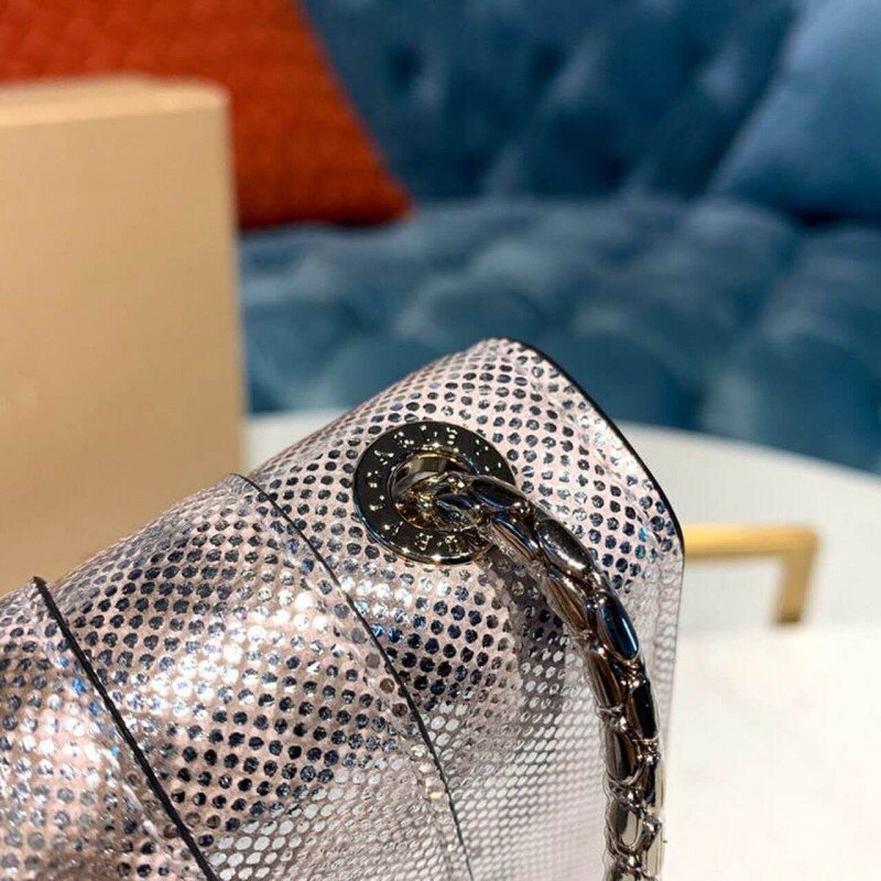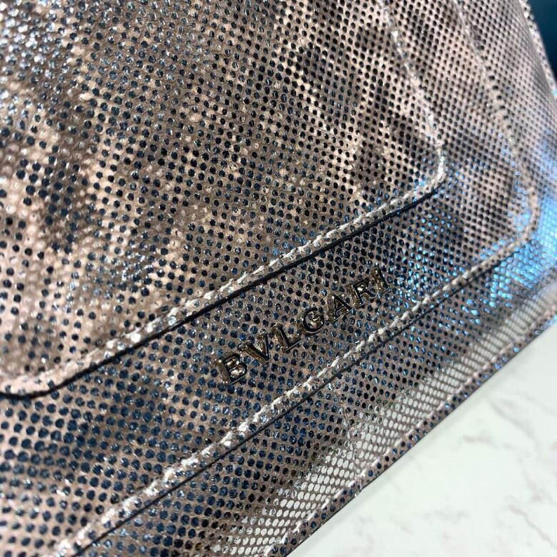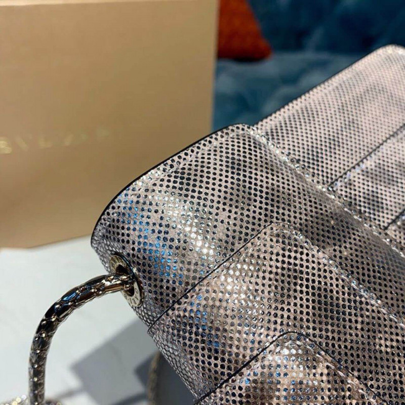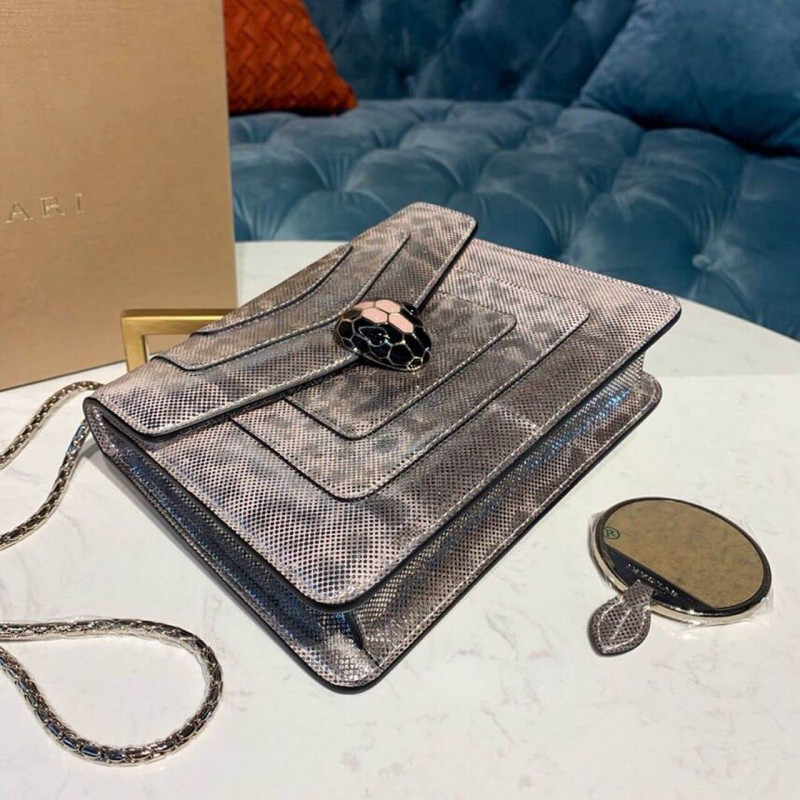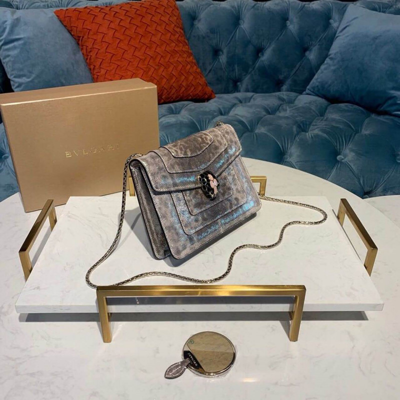 Serpenti Forever Crossbody táska fehér achát fémkarung bőrben. Az ikonikus kígyófej bezárása világos aranyozott sárgarézben, fekete -fehér zománccal és fekete ónix szemmel dúsítva. Az értékes, fehér agatás fémkarung bőrbe készítve ez a táska megtestesíti a bvlgari kézművesek szakértelmét az értékes anyagok elsajátításában az időtlen darabok készítéséhez. Az ikonikus kígyófejű bezárás hipnotizálás fekete -fehér zománccal és csábító szemmel a fekete onyxban. Egy könnyű aranyozott lánc, amelyet a kígyó testének és a kis zsebtükör ihlette, amely kiegészíti ezt a modellt. Kis méret, egyetlen gusset-rel.
