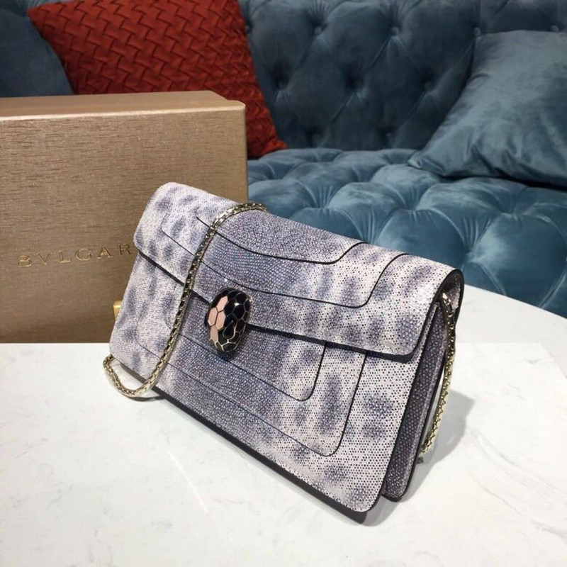 Serpenti örökre válltáska tejes opál fémes karung bőrben. Ikonikus kígyófej bezárása palládiummal borított sárgarézben, fekete zománccal és fekete onyx szemmel dúsítva. A Carmine Jasperben színezett sima borjúbőrből készült, ez a modell sárgaréz fényű aranyozott hardverrel rendelkezik. Az ikonikus kígyófej bezárása hipnotizálódik fekete -fehér zománcmal és csábító szemmel a zöld malachitban. Egyetlen nyitott zseb, állítható kígyó test alakú lánc és bőr heveder, zsebtükör.