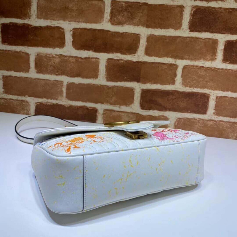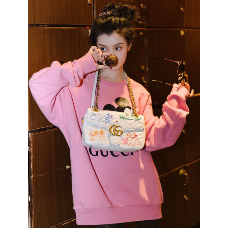 Mickey és Minnie Mouse játékos képe meghatározza ezt a GG Marmont kis válltáskát elefántcsont Matelasse bőrben. A Hold újévének ünneplésére a Disney legendás karakterei megjelennek a Gucci kész és kiegészítőiben a Cruise 2020 kollekcióhoz, színes nyomatokként, hímzett javításokként vagy Jacquard motívumokként. BR]] Disney X Gucci Disney