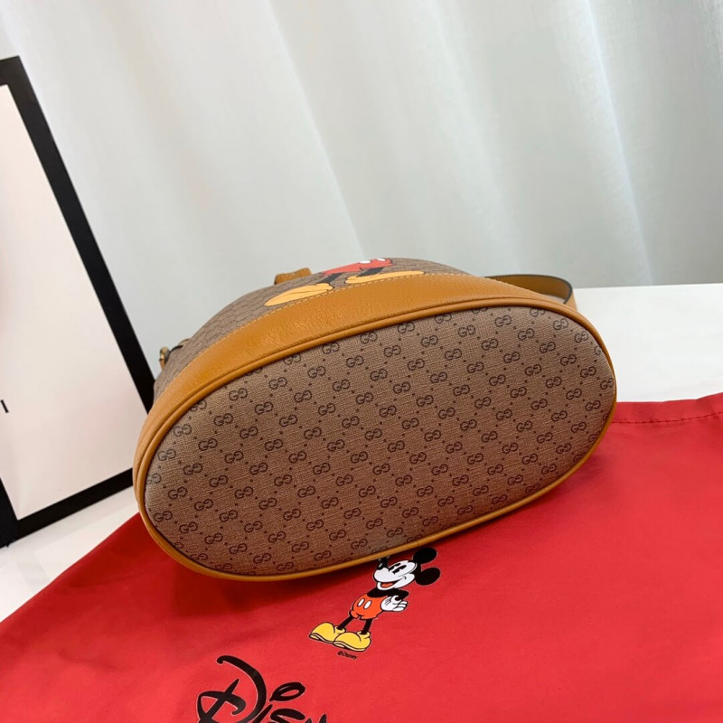 A Mickey Mouse játékos képe meghatározza ezt a GG vászon vödörzsákot, amelyet világosbarna bőr részletekkel díszítenek, amelyek egy szüreti megjelenést és érzést közvetítenek. A Hold újévének ünneplésére a Disney legendás karaktere megjelenik a Gucci kész és kiegészítői egészében a Cruise 2020 kollekcióhoz, színes nyomatokként, hímzett javításokként vagy Jacquard motívumokként.