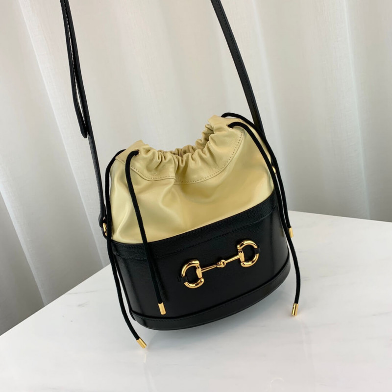 Az archívumok ihlette, a Gucci 1955 Horsebit Bucet táska egyesíti az eredeti részleteket, amelyeket először több mint hat évtizeddel ezelőtt mutattak be egy modern szellemmel, kiemelve a lóbitot. A Gucci genetikai kódjának részét képezi, a kettős gyűrűs és a sáv kialakítását a lovasvilágból kölcsönzött ház szimbólumok egyik legkülönbözőbb elemeként hozták létre. A hardver párosul az anyagok kortárs keverékével, a texturált és a puha fekete bőr kombinálásával, hogy egyedi tonális hatást hozzon létre. ] puha bőr teteje