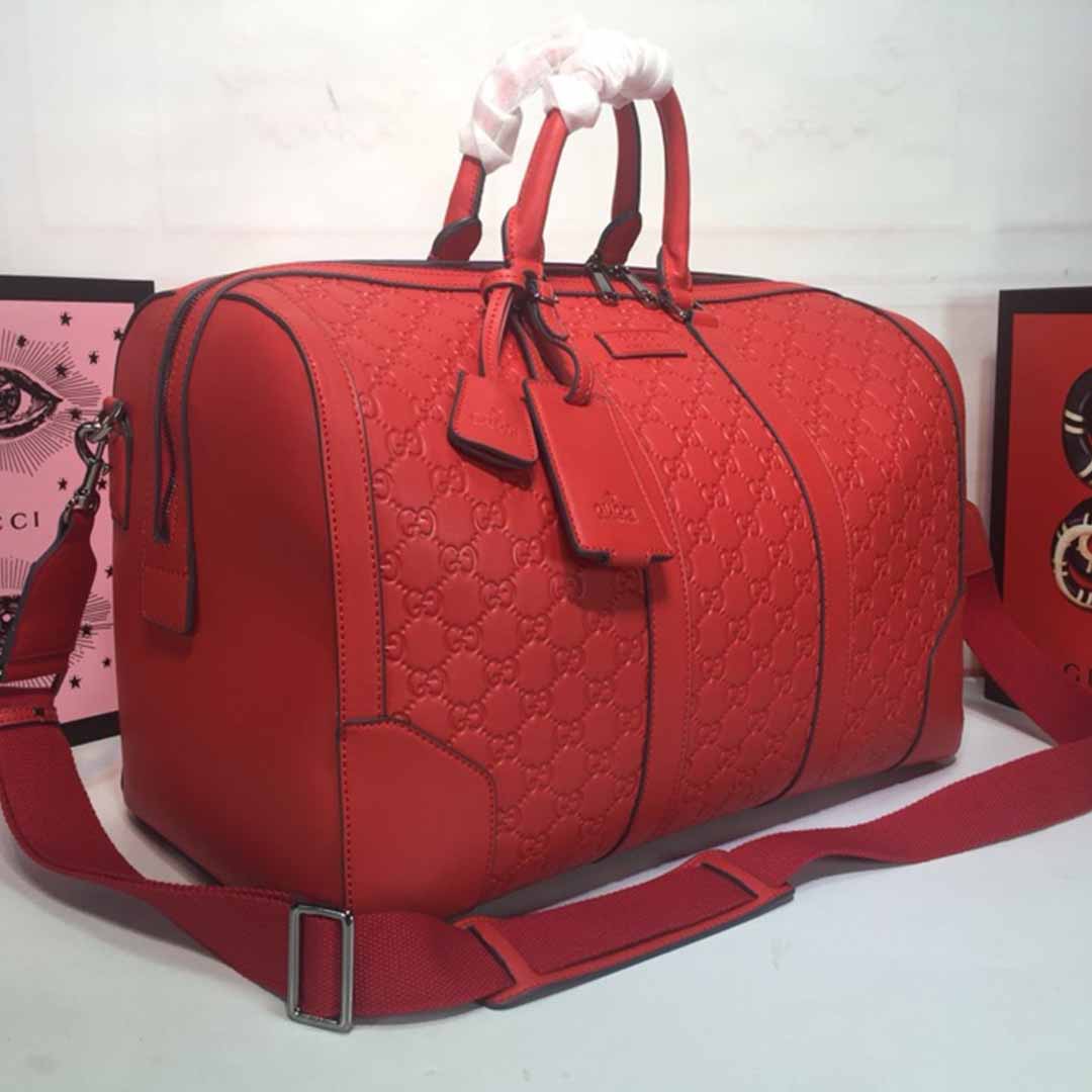 A Fall 2020-as kollekcióban bemutatott GG motívum új bevezetése textúrával játszik, a ház emblémájának dombornyomása egy fekete perforált bőrbázisra. A lágyság és az kissé fényes kivitel miatt a GG bőrt hordozható duffle-alakba építették, poggyászcímkével, reteszeléssel, dupla felső fogantyúkkal és eltávolítható vállszíjkal felszerelve.