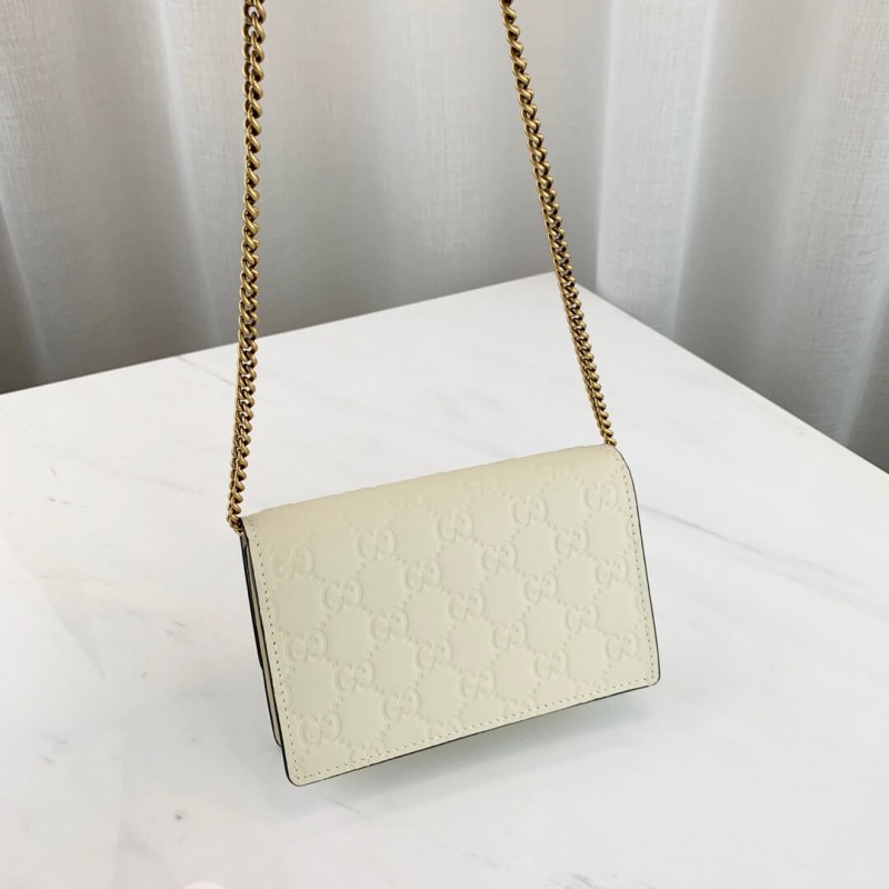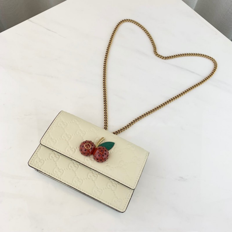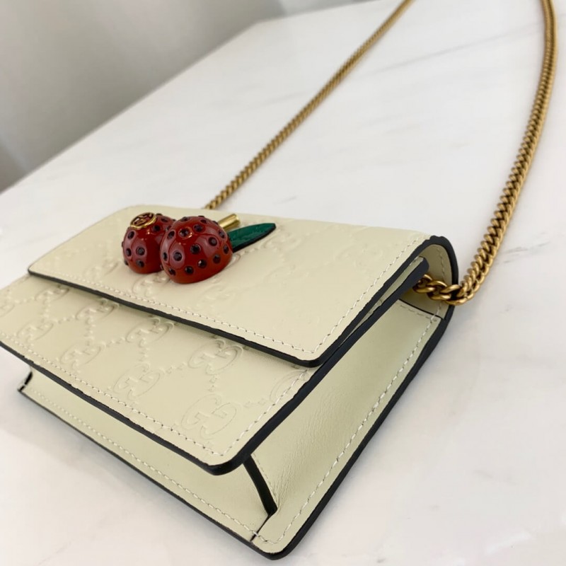 Egy háromdimenziós cseresznye-tartozék, beborított kristályokkal, kiemelkedik a fehér Gucci Signature Bőr háttérrel, és pop érzetet ad a mini táskához. A természet világának ihlette részletek továbbra is jellemzik a ház kaleidoszkópos nézetét. cseresznye kiegészítő berakott kristályokkal