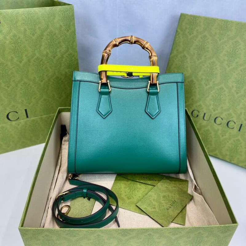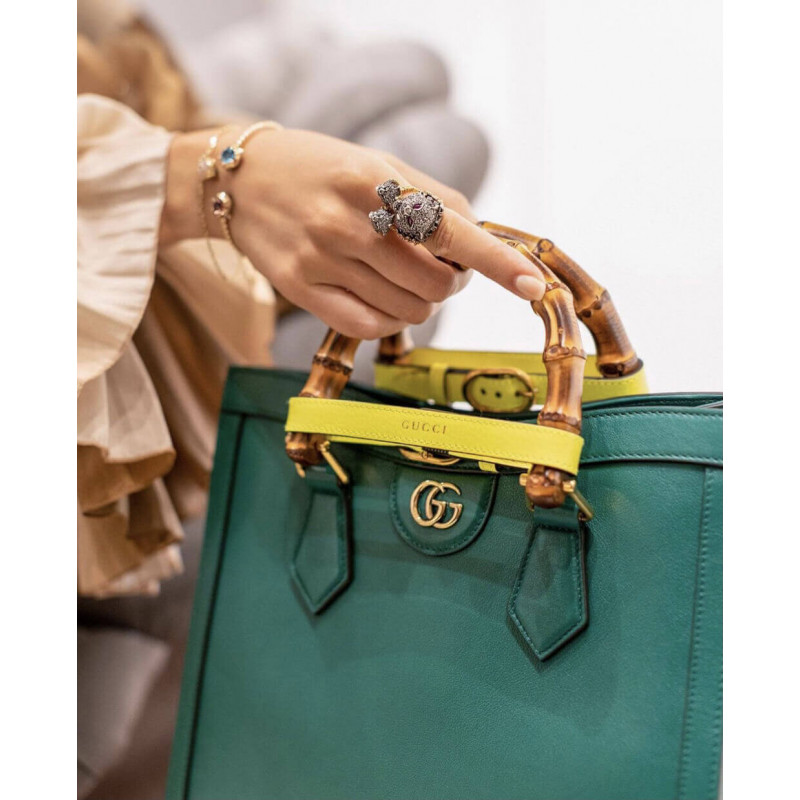 A ház felismerhető elemeit kombinálva a kis táskát a bambuszfogantyúk és a dupla G hardver határozza meg. A fekete bőrből kidolgozott tartozékot két neonszalag is hangsúlyozza, ez egy játékos utalás a fogantyúk formájának tartásához használt sávokra. ] Fekete bőr