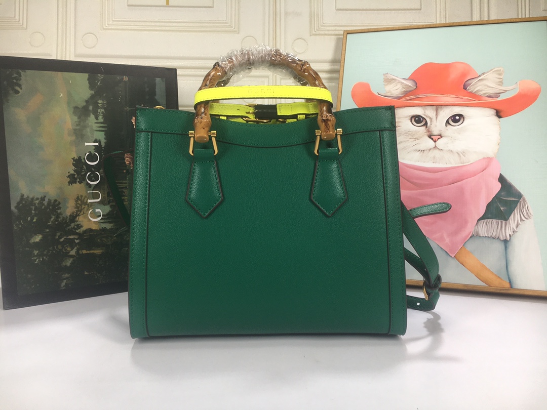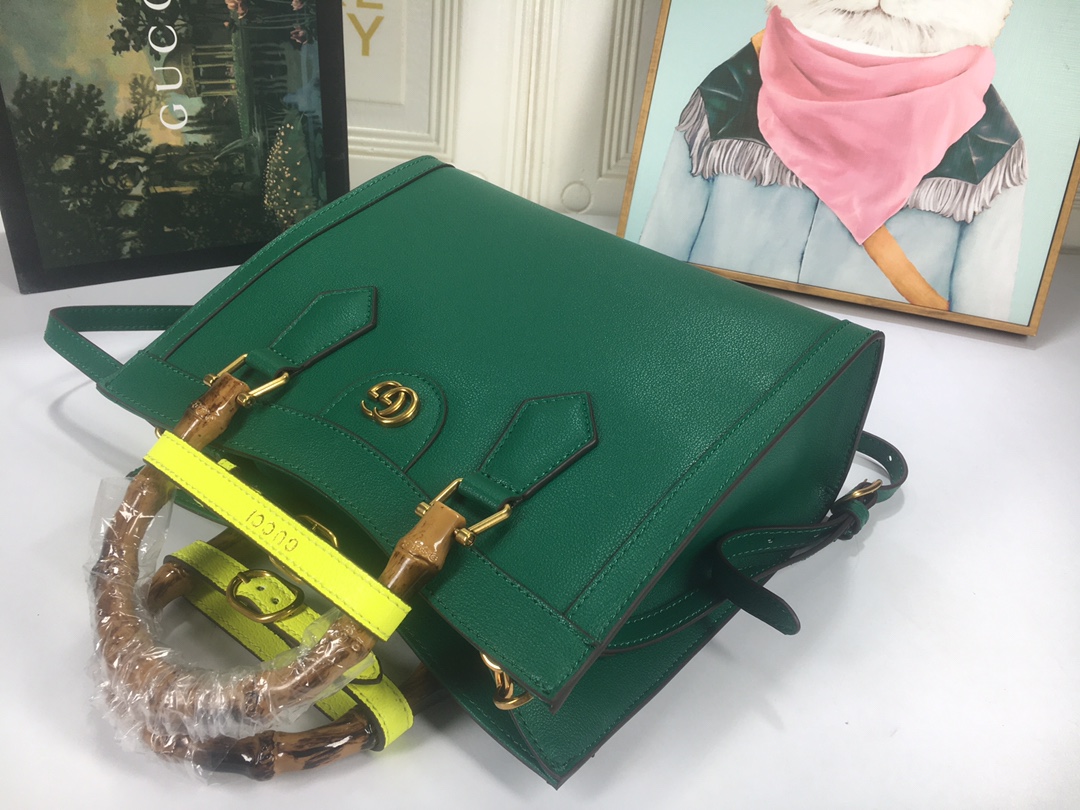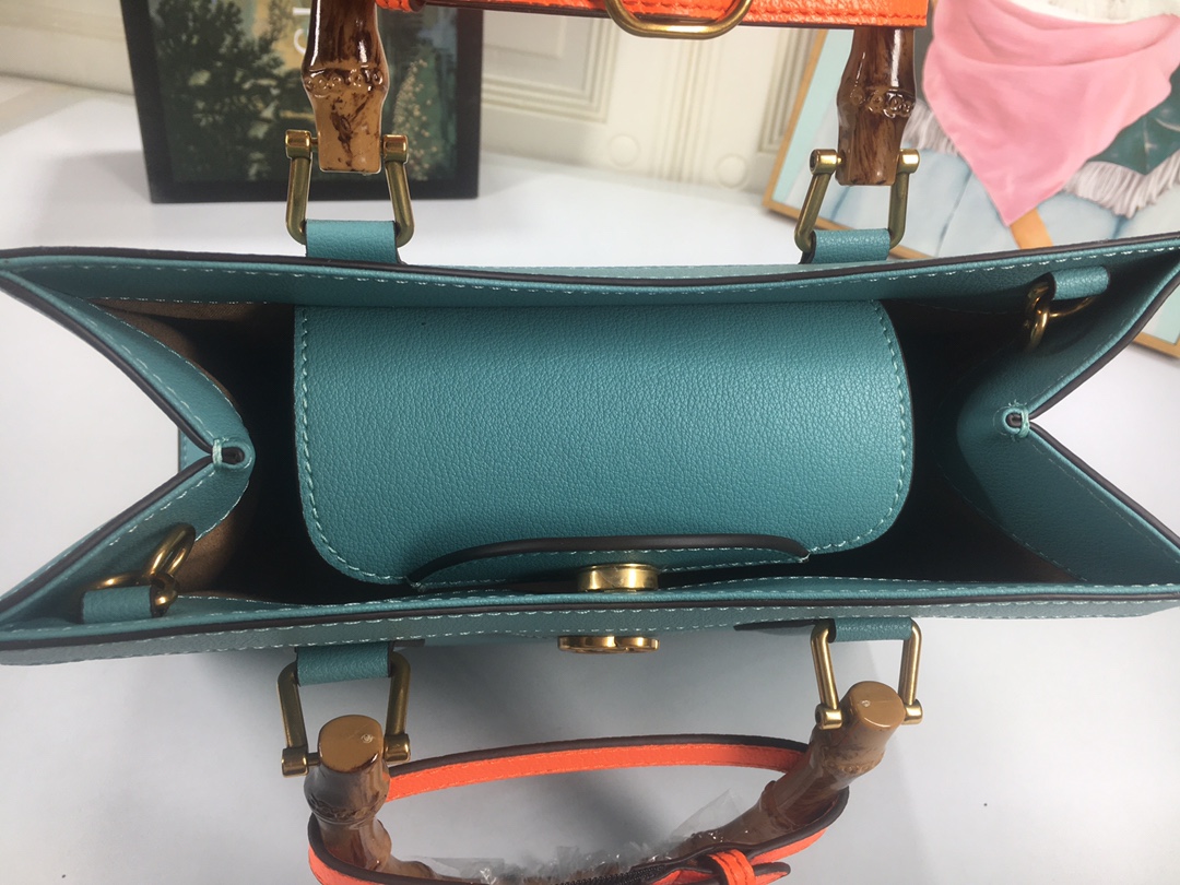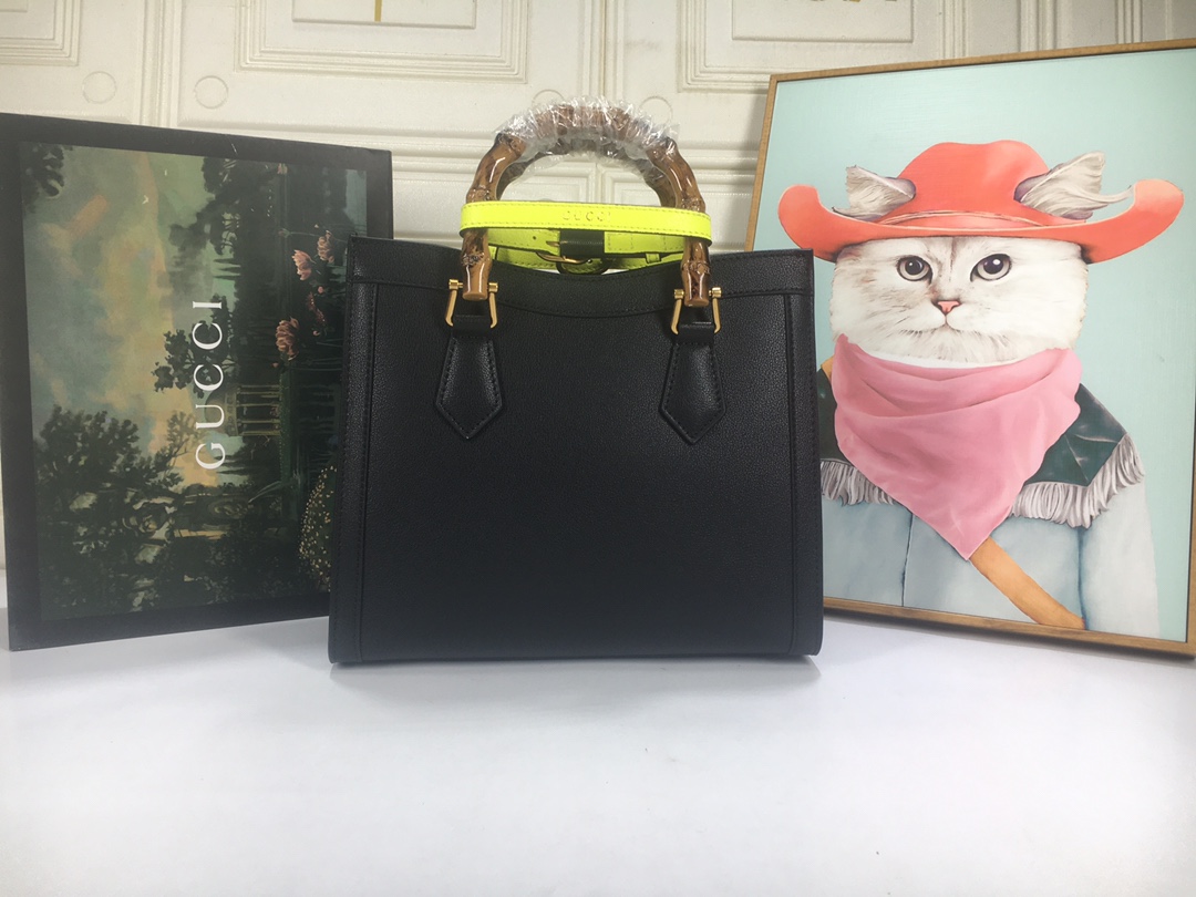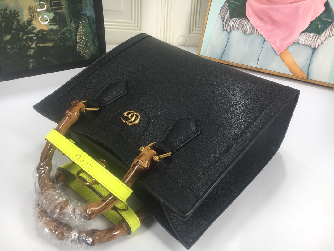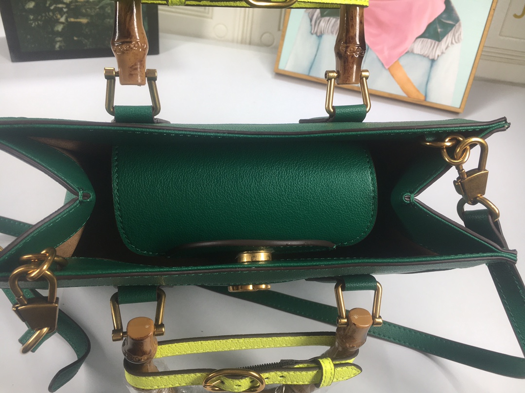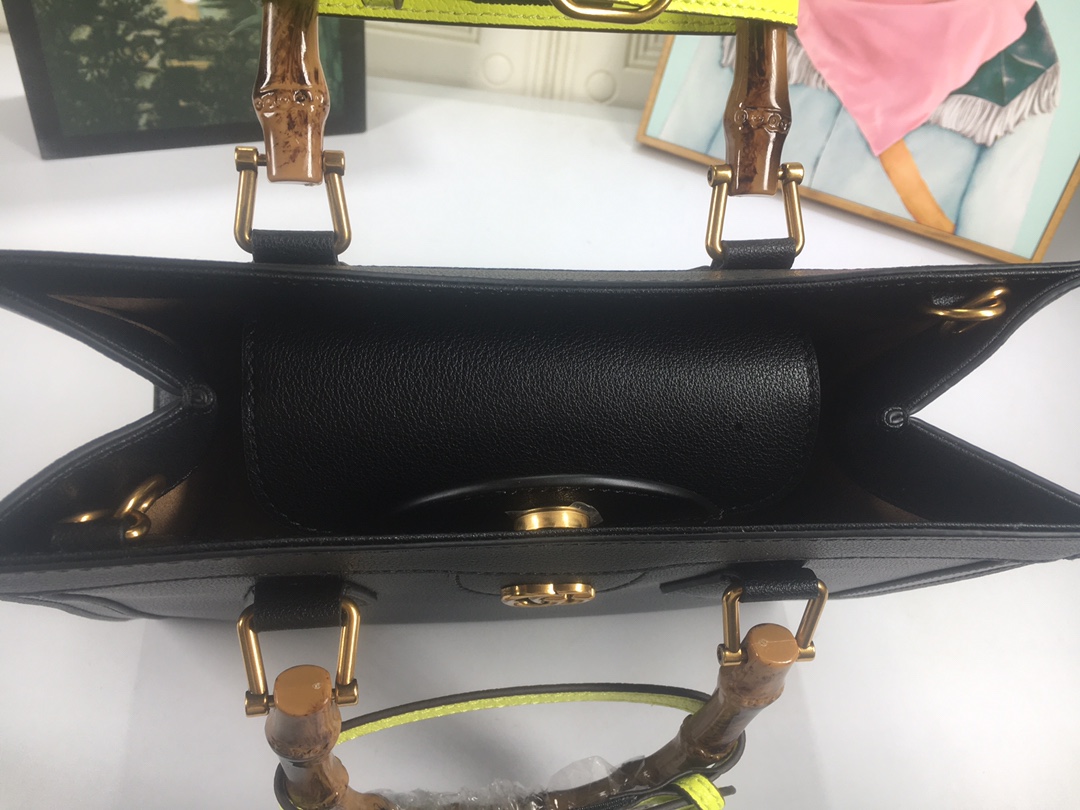 A ház felismerhető elemeit kombinálva a kis táskát a bambuszfogantyúk és a dupla G hardver határozza meg. A fekete bőrből készített tartozékot két neon heveder is hangsúlyozza, ez egy játékos hivatkozás a fogantyúk formájának tartásához használt sávokra.