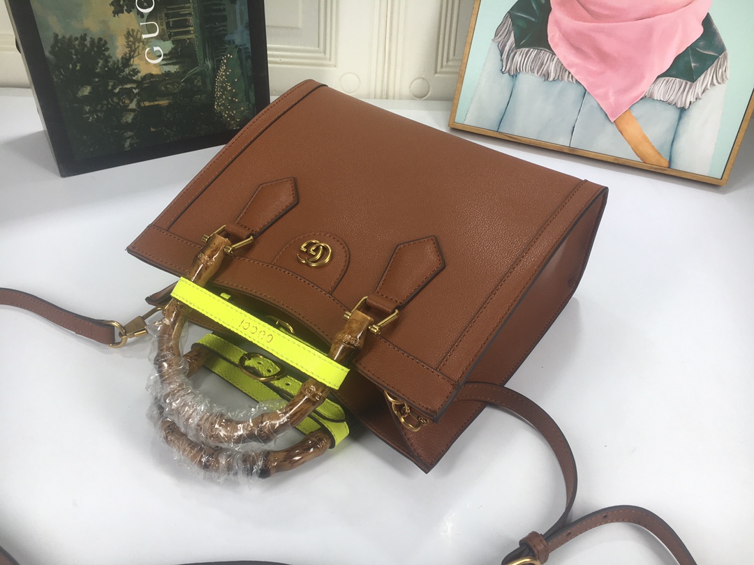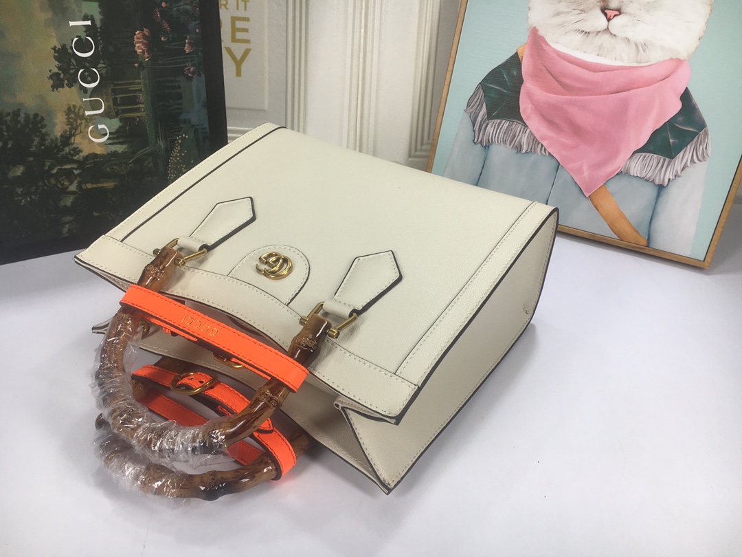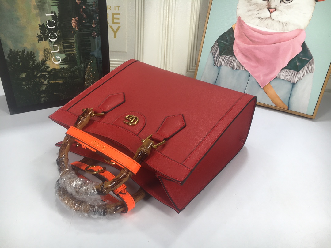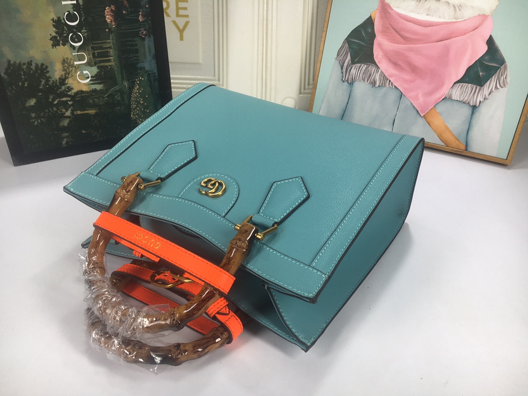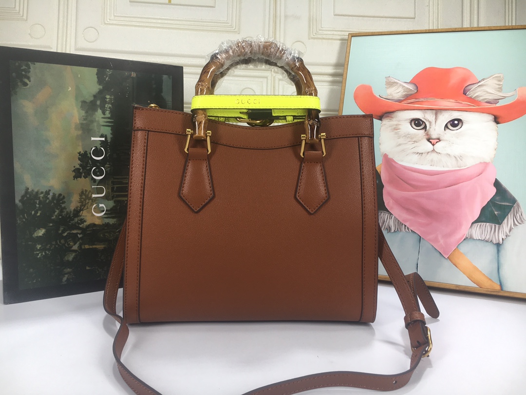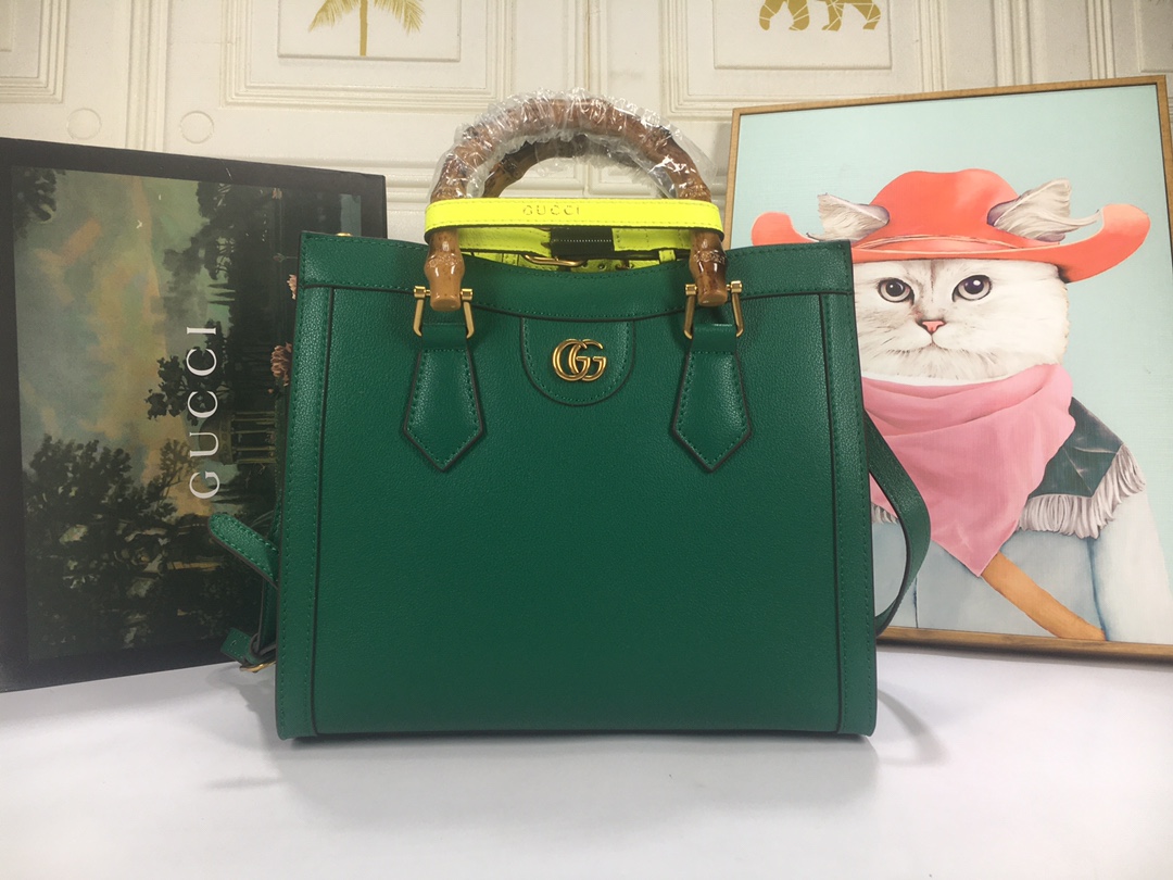 A ház felismerhető elemeit kombinálva a kis táskát a bambuszfogantyúk és a dupla G hardver határozza meg. A fekete bőrből készített tartozékot két neon heveder is hangsúlyozza, ez egy játékos hivatkozás a fogantyúk formájának tartásához használt sávokra.