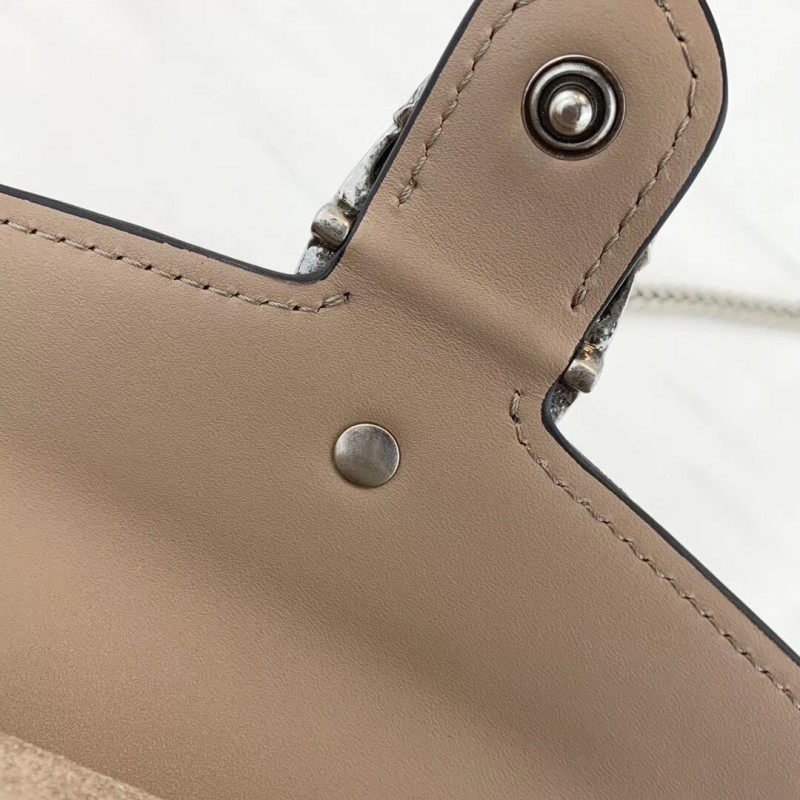 Egy strukturált GG Supreme vászon lánc szuper mini táska, amelynek kulcsgyűrűje használható, hogy ezt a táskát külön nagyobb táskához rögzítsék. A bezárásnak a texturált tigrisfejének bezárása van-egyedülálló részlet, amely a görög isten Dionüszosz istenére utal, aki azt állítja, hogy átlépte a Tigris folyót egy tigrisen, amelyet Zeus küldött neki.