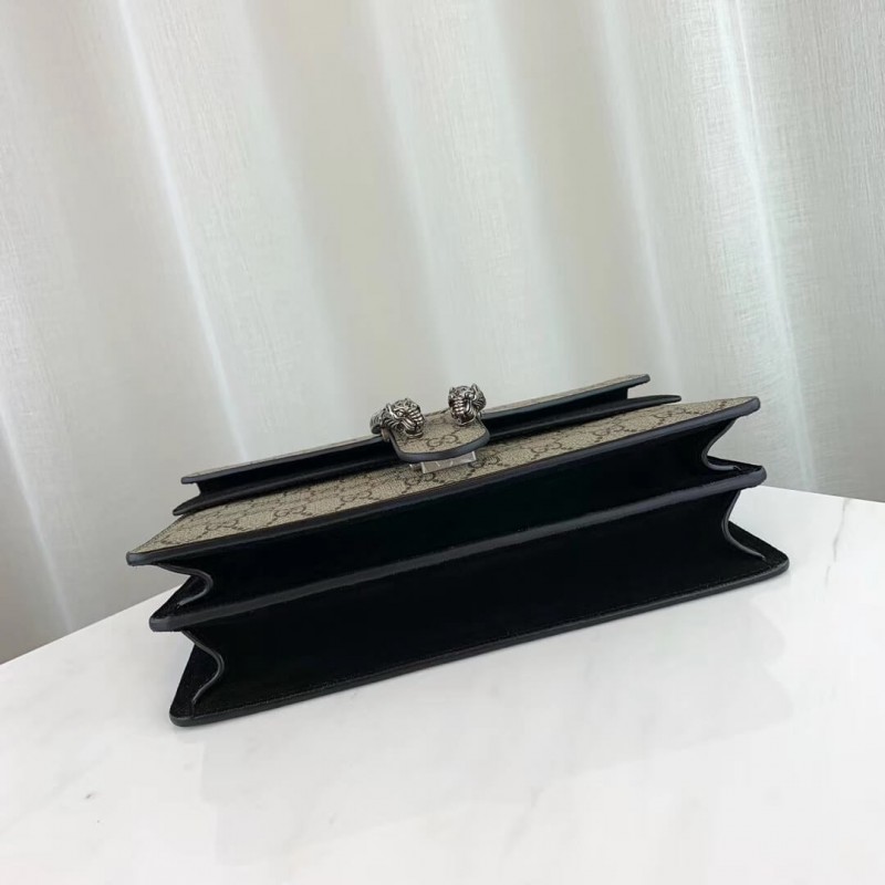 Egy strukturált GG Supreme vászon táska texturált tigrisfejünk bezárásával-egy egyedi részlet, amely a görög Dionüszosz Istenre hivatkozik, akinek a mítoszában azt állítják, hogy átlépte a Tigris folyót egy tigrisen, amelyet Zeusz küldött neki. A csúszó láncszíj többféle módon viselhető, a váll és a felső fogantyú között váltva. Fekete velúr részletekkel