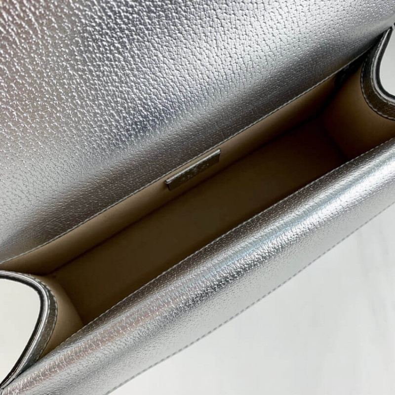 A Dionysus válltáska fényes ezüst bőrben van bemutatva. A most meghatározó Tiger Head Closurea egyedi részlet, amely a görög isten Dionüszosz istenre utal, aki azt állítja, hogy a Tigris folyót átlépte egy Zeusis által küldött tigrisre, amelyet tovább erősítettek a csillogó kristályokkal. A csúszó láncszíj többféle módon viselhető, váll, kereszttest és egy felső fogantyú között váltva. Kristályok
