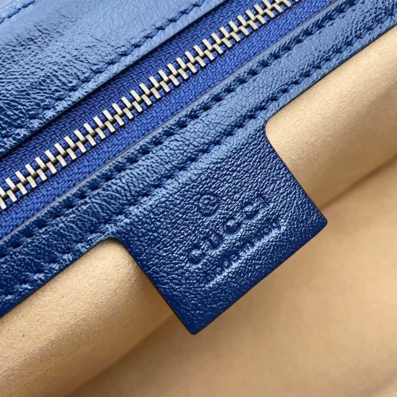 A GG Marmont táskát fehér átlós Matelasse steppelt bőrben vezetik be a Fall 2020-as előadásra, egy csavart Torchon dupla G díszítéssel. A kis láncú válltáska megkülönböztetett, lágyan strukturált alakját kontrasztos sötétkék csövekben vázolják, kiemelve annak szárnyának bezárását. A csúszó láncszíj simán átalakul az egyetlen vállhosszról a duplázott felső fogantyú hosszára, hogy többféle módon viselje a táskát. BR]] sötétkék bőr burkolat