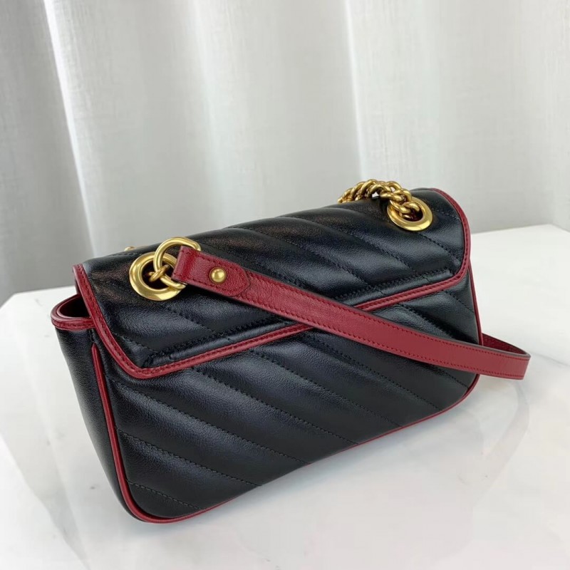 A GG Marmont táskát újraképzték a 2019-es előadásra, fekete átlós Matelasse paplanból készült bőrből, és egy csavart Torchon Double G díszítéssel készítik el. A kis láncú válltáska megkülönböztetett, lágyan strukturált alakját kontrasztos cerise csövekben vázolják, kiemelve annak szárnyának bezárását. A csúszó láncszíj simán átalakul az egyetlen vállhosszról a duplázott felső fogantyú hosszára, hogy többféle módon viselje a táskát.