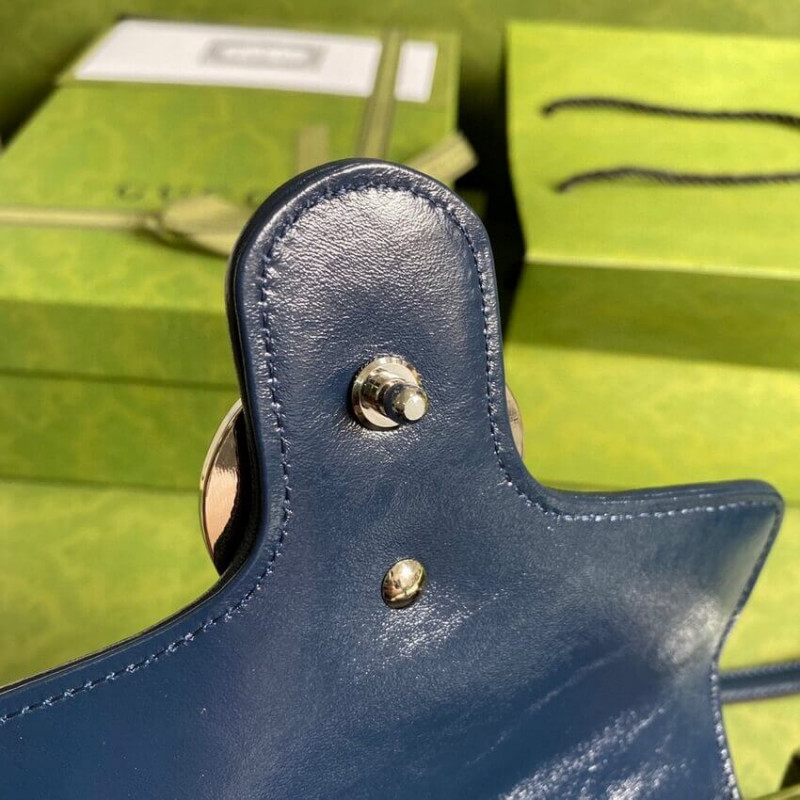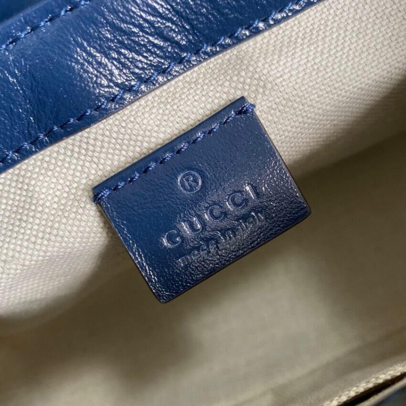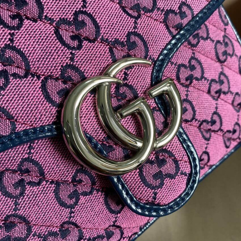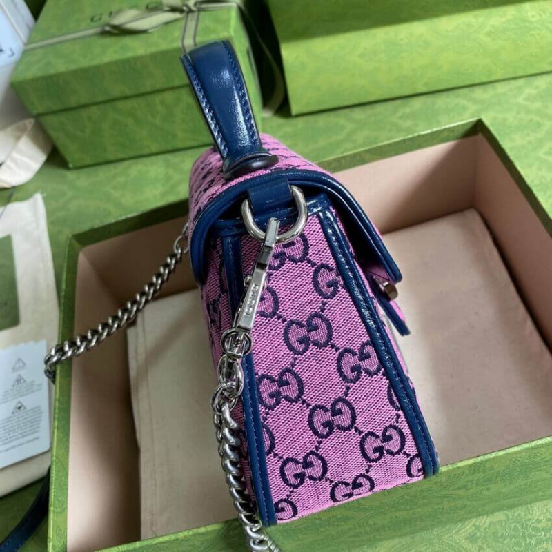 A Gucci archívumok variációin belüli új lehetőségeket átfogva, a gyűjtemény különböző darabjai új lencsét biztosítanak az emblematikus GG rombi motívum megtekintéséhez. Már a ház logójának fejlődése, ismét újból ábrázolják a világos színű témák sorozatában, amely szinonimává vált a kreatív igazgató elképzelésével. Ez a GG Marmont mini felső fogantyú táska a GG multicolor kollekció része. ] Ezüst tónusú hardver