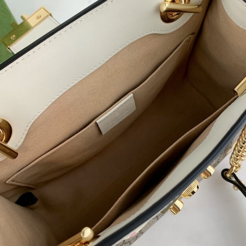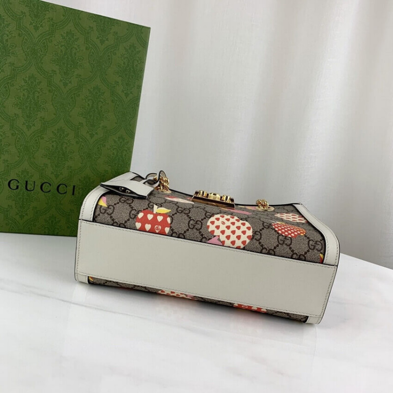 A gyümölcsök és a zöldségek a márka jelenlegi divattervező elemévé váltak, teljes életerő injektálva az új sorozatba, élénken értelmezve a márka ártatlan és szórakoztató hangulatát. Ez a kis lakat sorozatú válltáska érdekes Gucci Heart Apple mintát használ a téma visszhangzására.