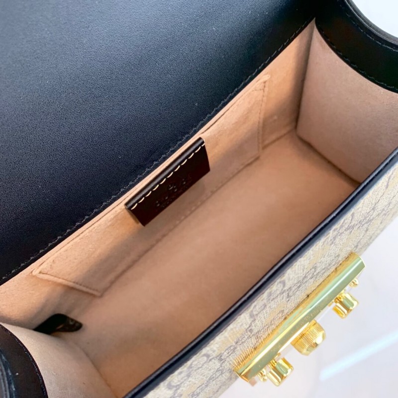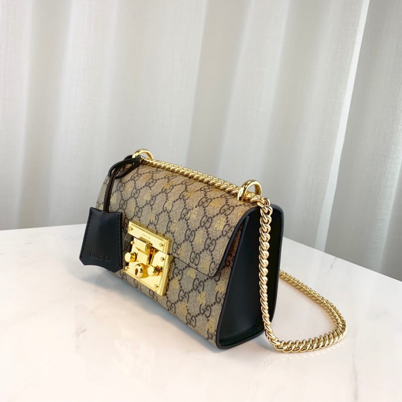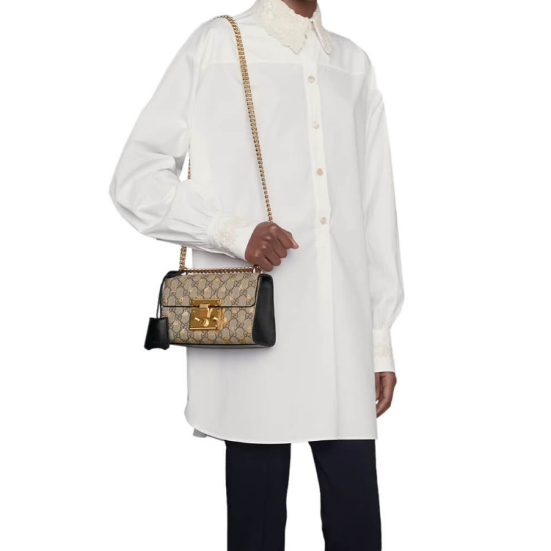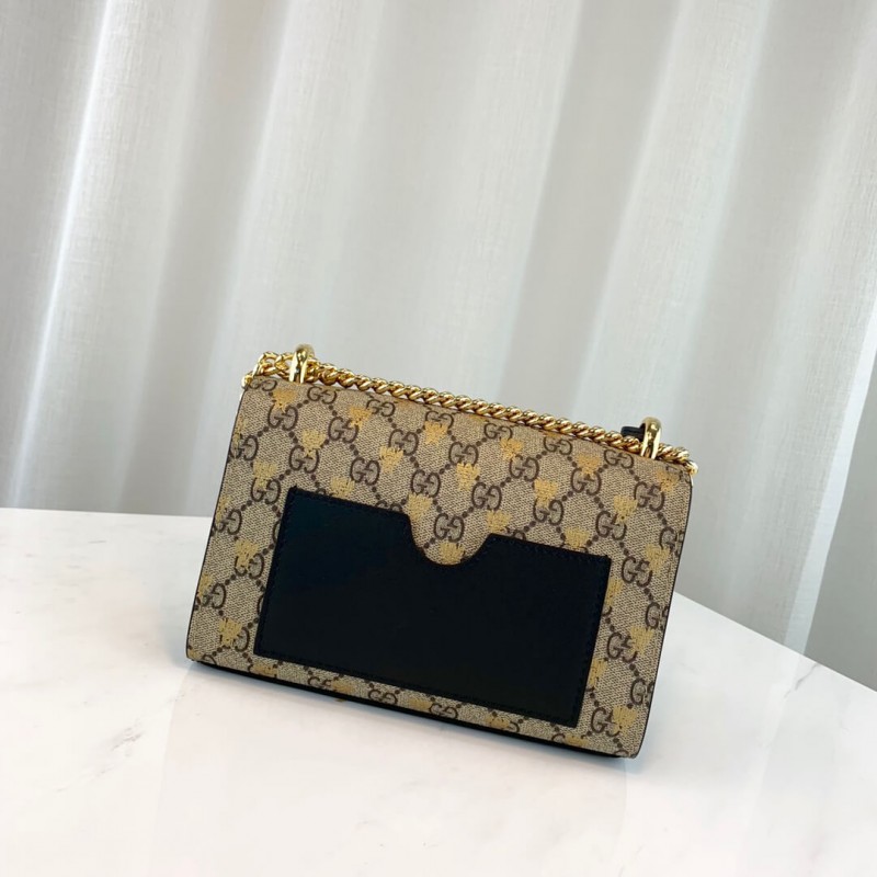 Egy kicsi, strukturált válltáska, amelynek kulcstartó zárja le az archívumból, a kulcsot egy bőrkulcs -tokba helyezik, amely a lánc körül hurkol. A csúszó láncszíj többféle módon viselhető, a váll és a felső fogantyú között váltva. A GG Supreme vászonban készült, allover arany nyomtatott méhek történelmi szimbólumával, a ház archívumából, először az 1970 -es években vezette be. , alacsony környezeti hatású anyag