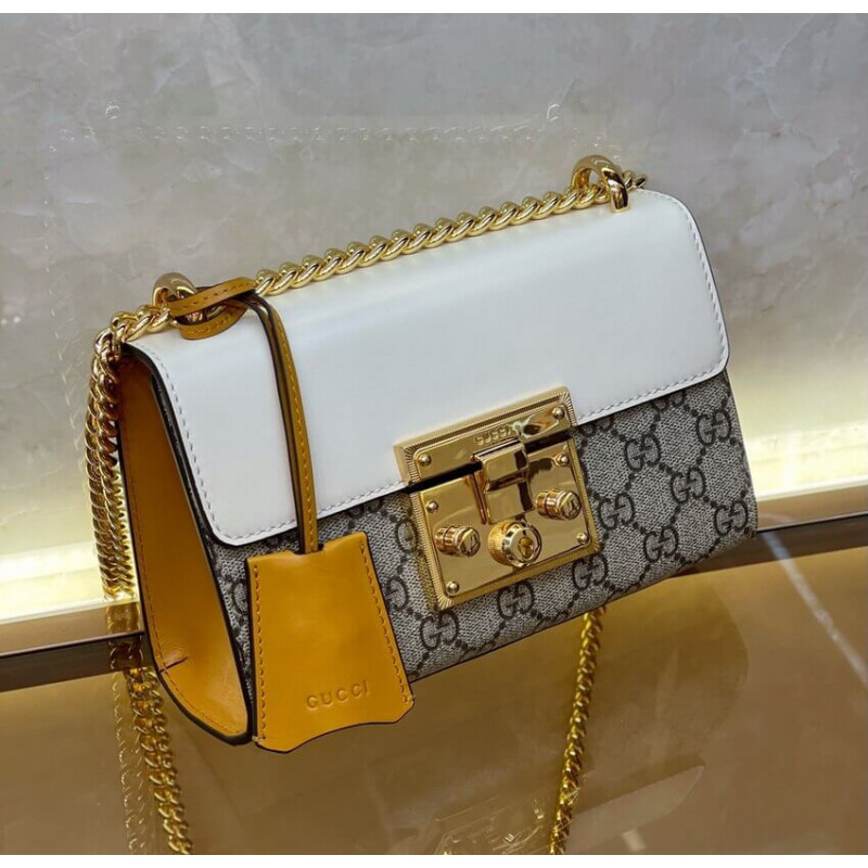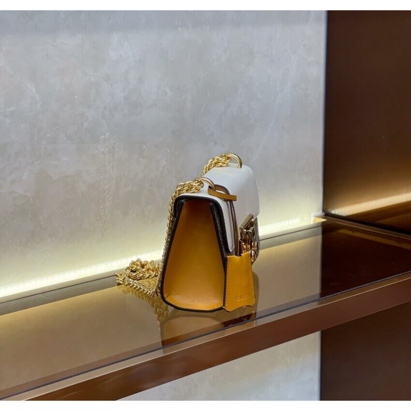 Egy kicsi, strukturált GG Supreme vászon táska, bőr tetejével és a kulcszár bezárásával. A csúszó láncszíj többféle módon viselhető, a váll és a felső fogantyú között váltva.
