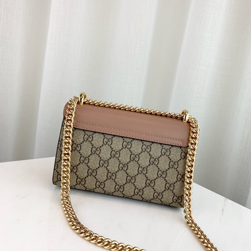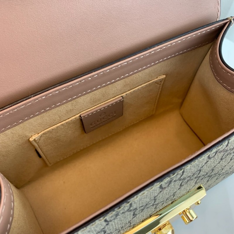 Egy kicsi, strukturált láncú válltáska, amelynek kulcstartó bezárása egyenesen az archívumból húzódik, a kulcsot egy bőrkulcs -tokba helyezik. A táskát tovább javítja az arany hangjelzők és a gondosan elhelyezett GG gyöngycsapok.