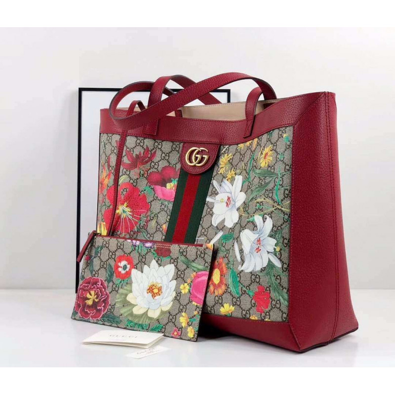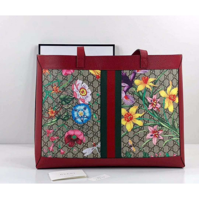 BEIGE/EBONY GG SUPREME vászon növényi nyomtatással, alacsony környezeti hatású anyaggal, piros bőr díszítéssel