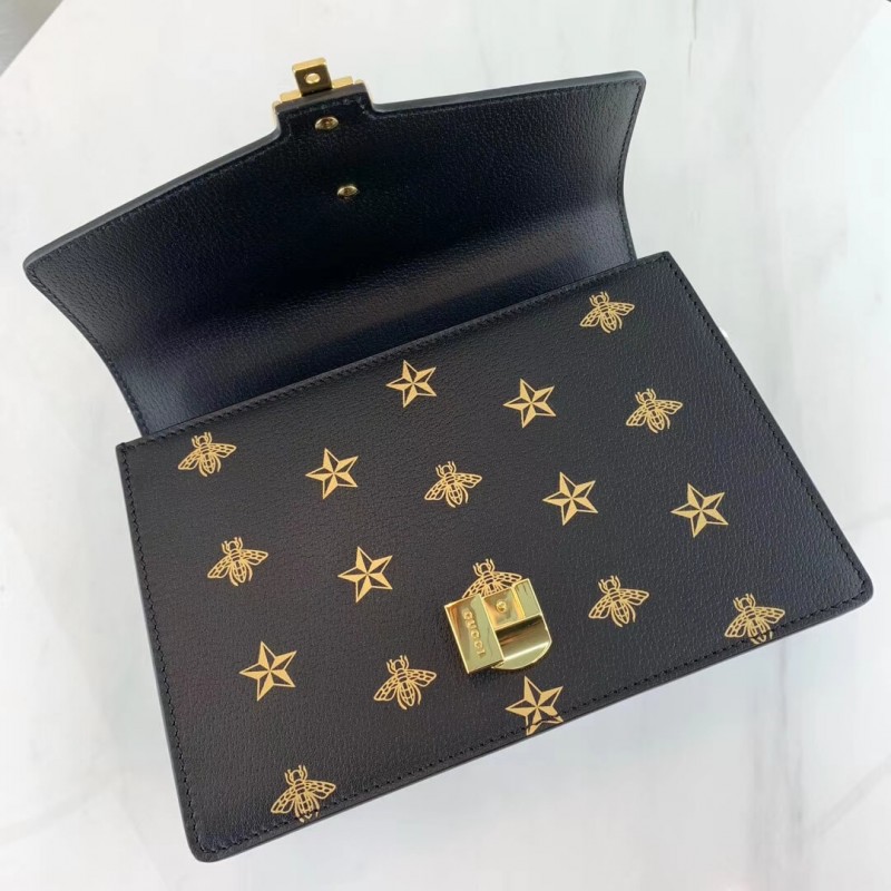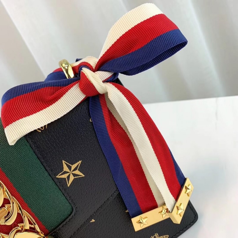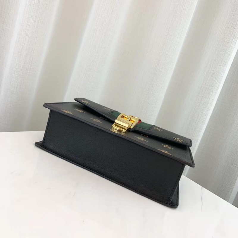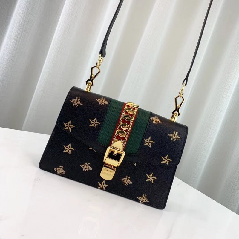 A házkódok játékos keveréke, a Sylvie válltáska ötvözi az arany fémláncot és a csatot a kontrasztos webcsík részleteivel. A 60 -as és 70 -es évekből származó aláírási Gucci alakot egy modern iterációban hozják vissza az archívumokból, méhek és csillagok nyomtatott bőrben. A strukturált sziluett két hevederrel érkezik: egy bőr vállszíj és egy grosgrain szalag, amely a felső fogantyúról vállra alakul. BR]] Fényes arany tónusú hardver