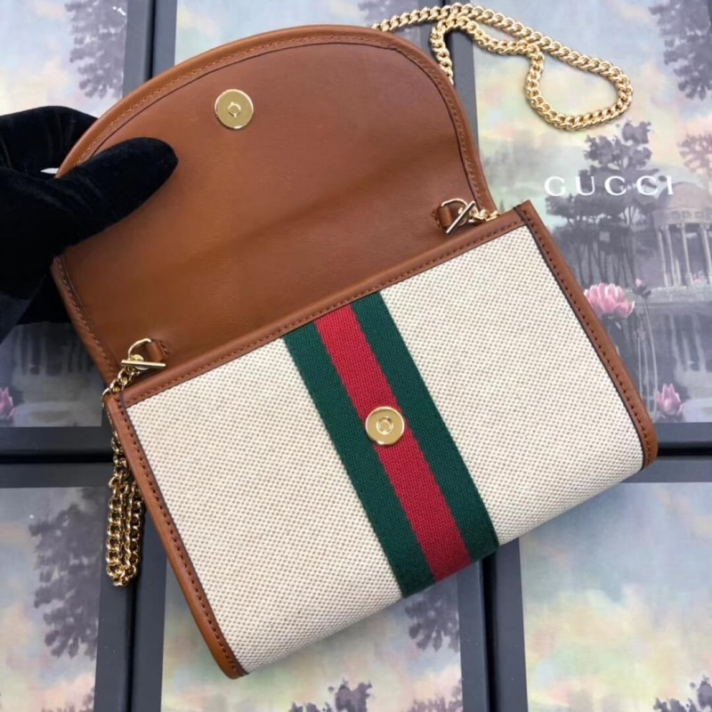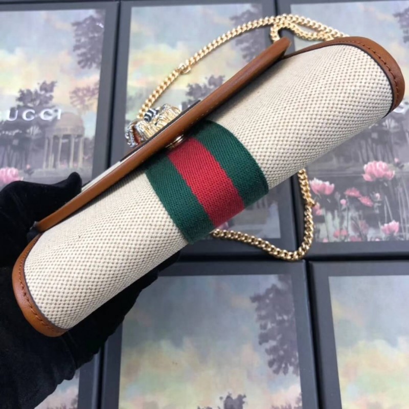 Egy szövött vintage ihletésű vászonból készített mini táska. A Rajah Universe minden szezonban új iterációkkal fejlődik. A ház webének és a zománcozott tigrisfejnek a kombinációja, amelyet Hattie Carnegie 1940 -es évek archívumának divat- és ékszer -tervezőjének vintage darabja ihlette, a kiegészítőt egy levehető láncszíj fejezi be. Az új formákat és az aláírást a Gucci vonalakat szövetek keverékében ábrázolják, és egy természetéből adódóan nyári érzéssel átitatják. Zöld és piros web