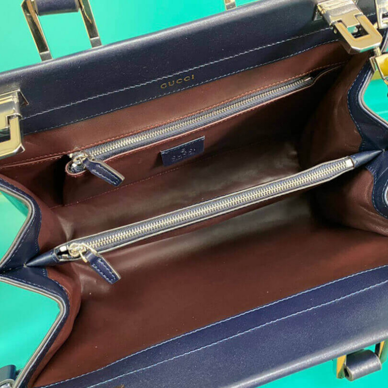 A Gucci Zumi kis felső fogantyúzsákot egy tricolor -variációban vezetik be, cerise és vaj átlós csíkokkal, amelyek sötétkék sima bőrbázisra helyezkednek el. Az összekapcsolódó G lóbitot, a ház két legkülönbözőbb kódjának kombinációját, az arany- és ezüst tónusú fémek dinamikus keverékében mutatjuk be a kifinomult sziluett ellen. Először a Párizsban a Le Palace színházi körüli környezetében mutatták be, a Gucci Zumi Line a színésznő és a kísérleti zenész, Zumi Rosow nevét veszi, aki a 2019. tavaszi nyári kifutópályát sétálta a táskát.
