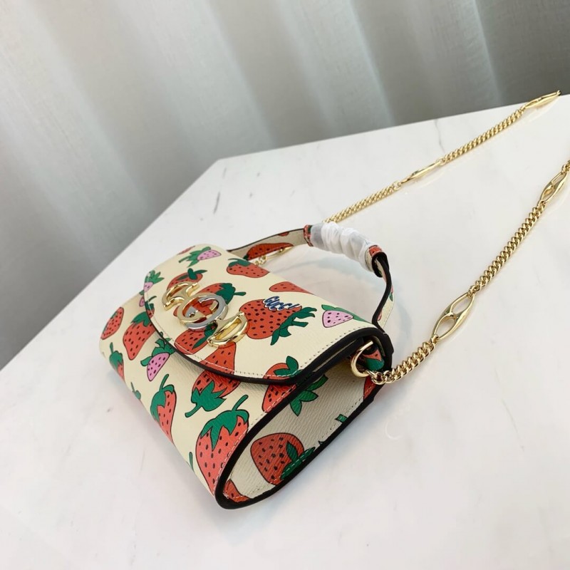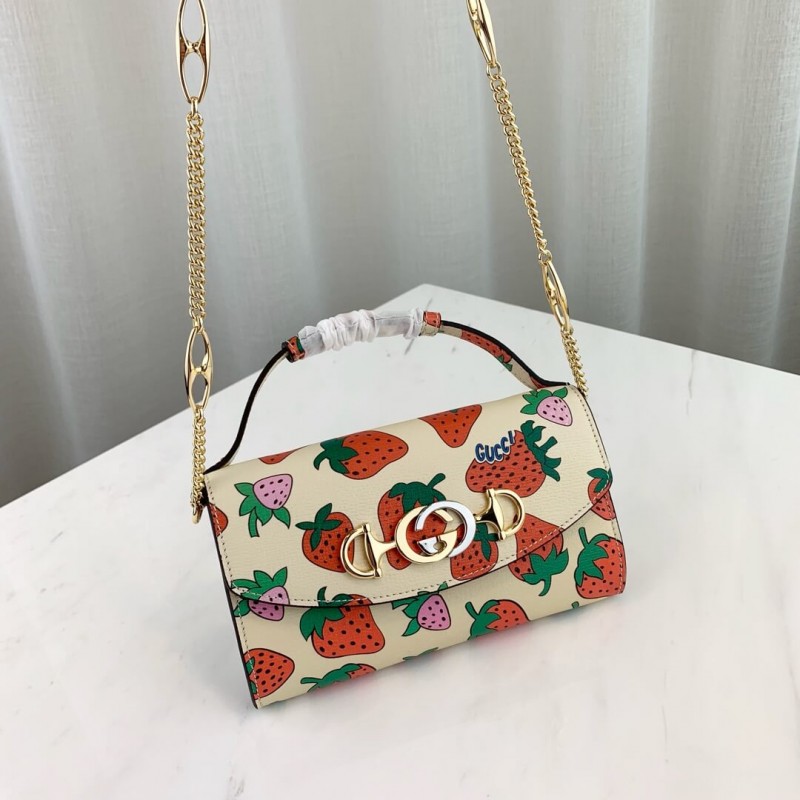 Az elefántcsont bőrén bemutatva a Gucci Strawberry Print a 2019. tavaszi nyári kifutópályán sétált, és a 70 -es évek szüretét idézte elő. A kis válltáskán látható, ellentétben áll a reteszelő G lóbittel, az ezüst és az aranyhangok modern keverékében. A táska hordozható, kereszttestet, amelyet tengelykapcsolóként használhat, amikor a láncot eltávolítják és felső fogantyúként viselik, amikor a bőrfogantyú meghosszabbodik. A Párizsban a Le Palace színházi körüli környezetében bevezetett Gucci Zumi Line a színésznő és a kísérleti zenész, Zumi Rosow nevét veszi, aki a 2019. tavaszi nyári kifutópályán sétált.