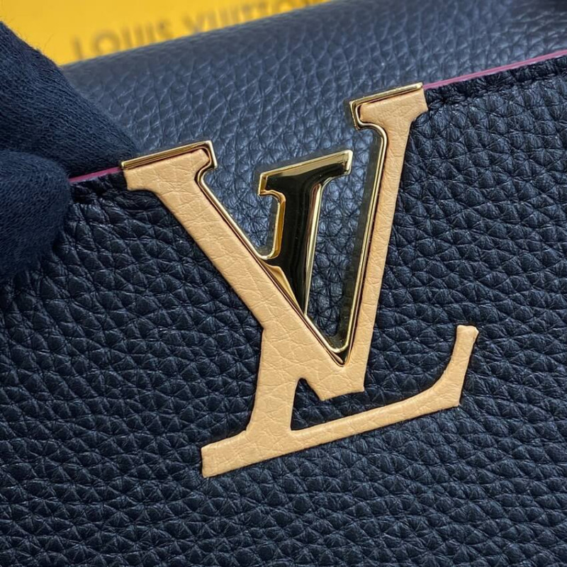 A capucines mm kézitáska fekete taurillon bőrből készül, és egy széles, levehető hevederből áll, amelynek egyik oldalán Louis Vuitton, a hímzett Karakoram -minta háromszögek és a monogram virágok egyik oldalán található. A váll és a test kereszthasználata mellett a bőr felső fogantyúja lehetővé teszi az elegáns könyök és a kéz hordozását. Trim
