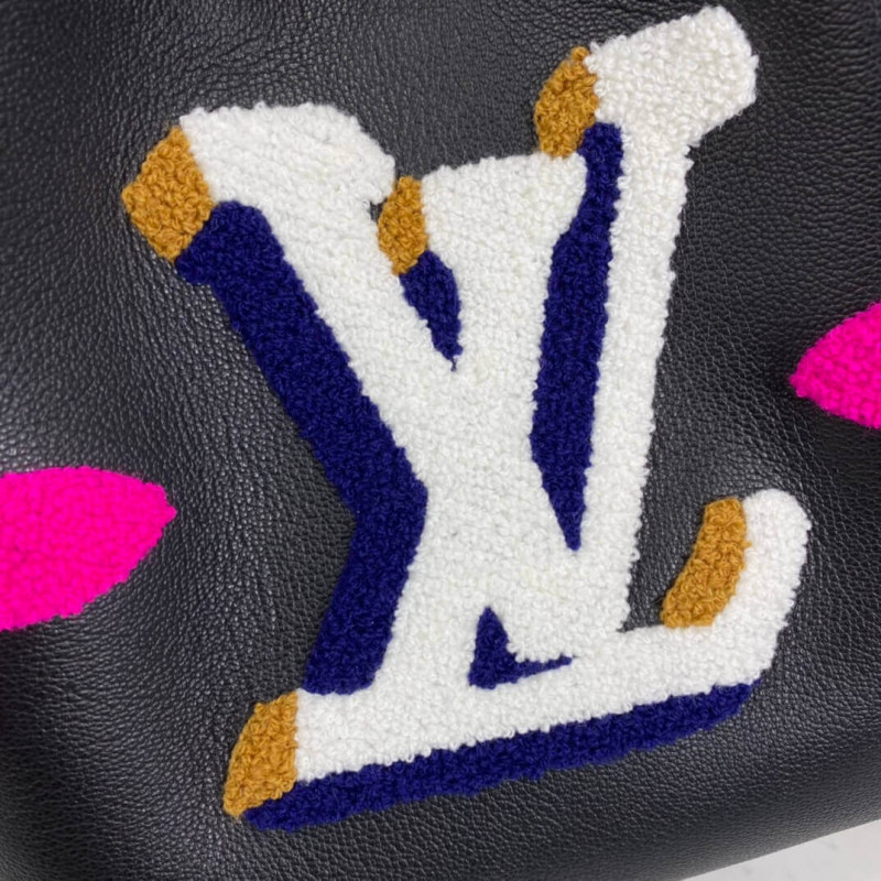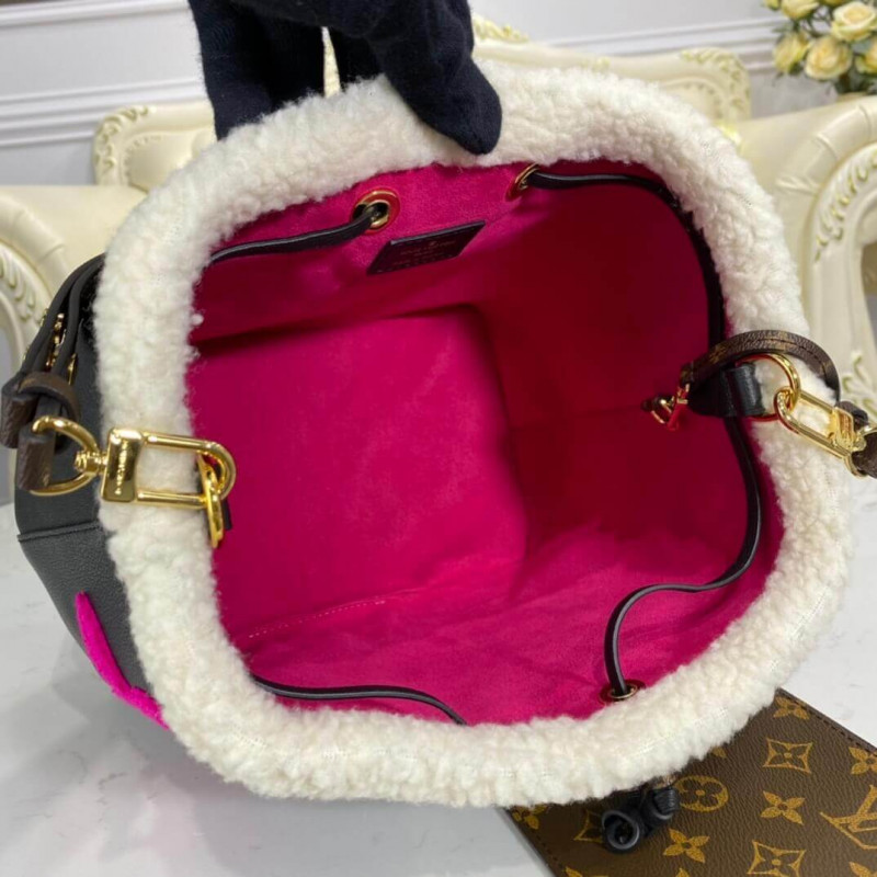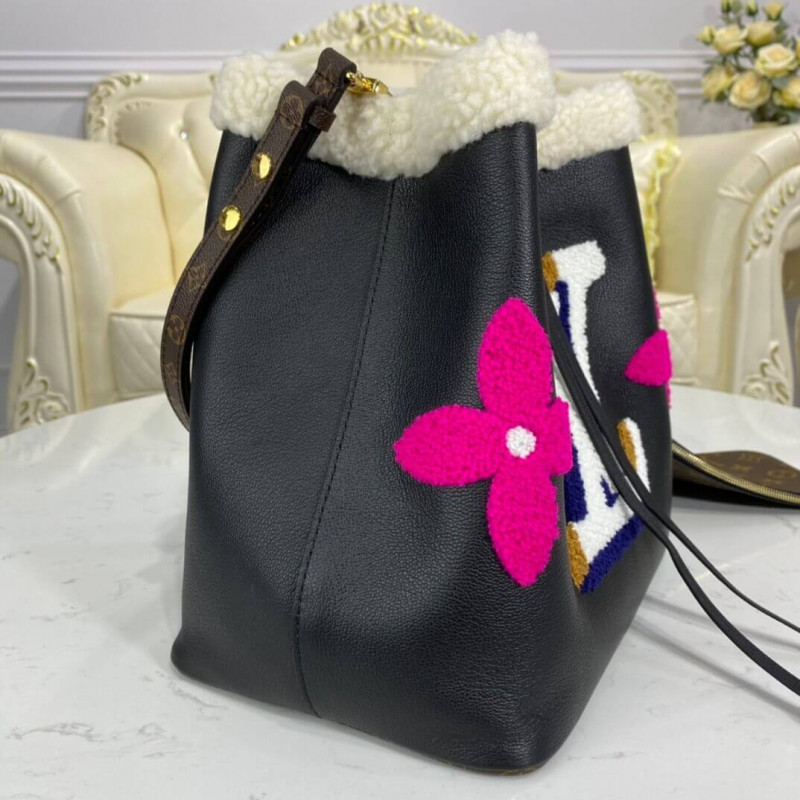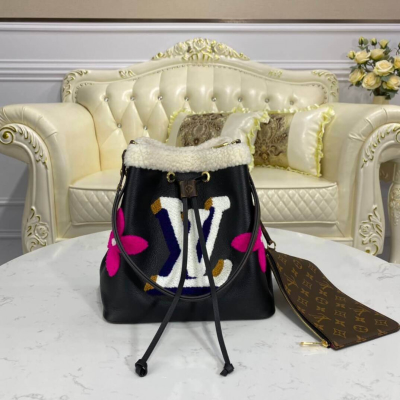 A neonoe szemcsés bőrből és nyíróból készül, és aviator érzést kelt ez a klasszikus vödörzsák. A nyíró, festett krém, kék, karamell és rózsaszín, óriási LV kezdőbetűket és monogram virágokat készít a fekete bőrön. Ennek a könnyű táskának eltávolítható hevederje van egy váll vagy a testhordozóhoz.