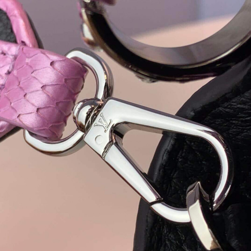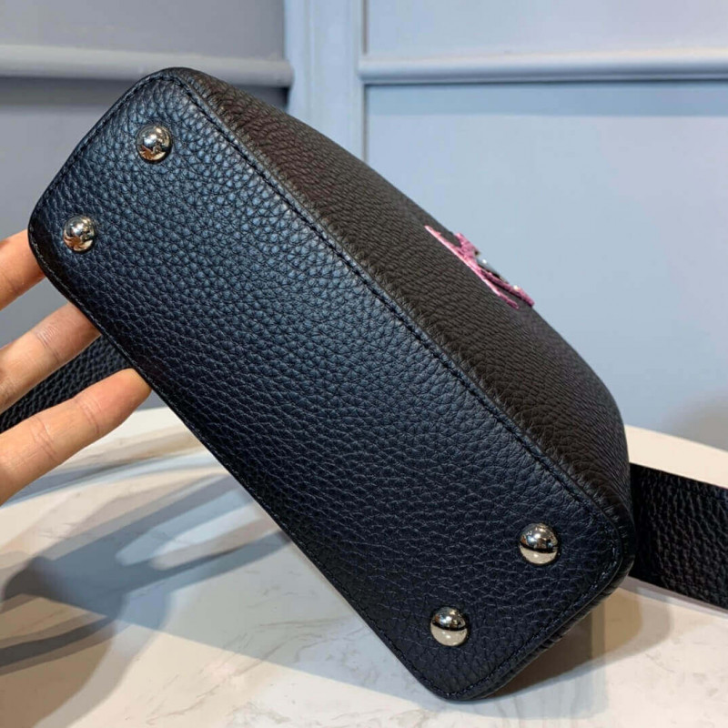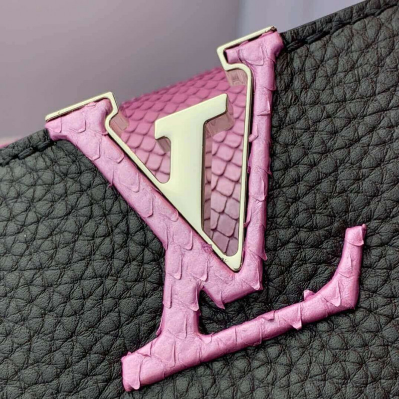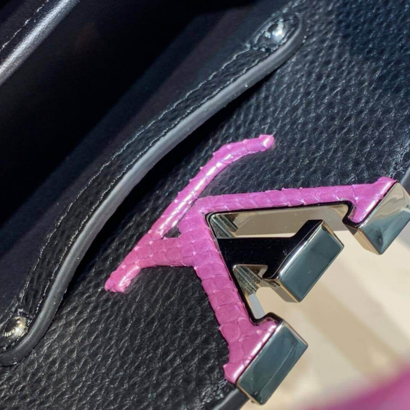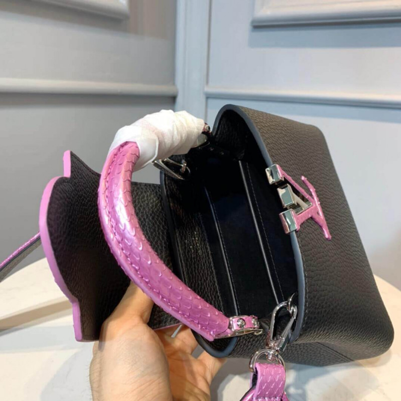 Ez a capucines mini kézitáska teljes szemcsés taurillon bőrben fel van ékezetes felső fogantyúval, kétirányú szárnyassal és egy LV aláírással, amely a Shiny Ayers kígyóbőrből készült. Bájos mérete és drága anyagok miatt ez a kapucinok értékes, kifinomult kiegészítővé teszik napi vagy este. A széles, leválható heveder extra élt kölcsönöz, és a váll vagy a test kereszthasználatának lehetőségét kínálja. BR]] borjúbőr bélés
