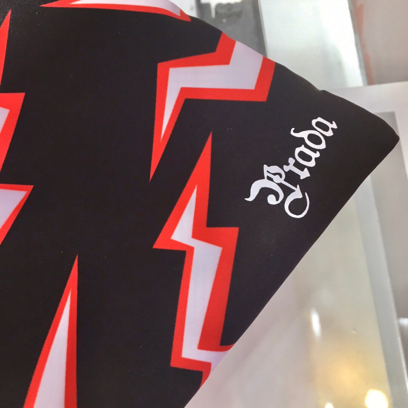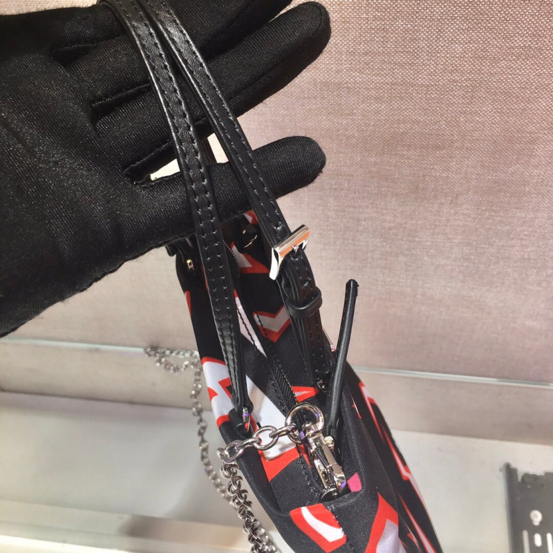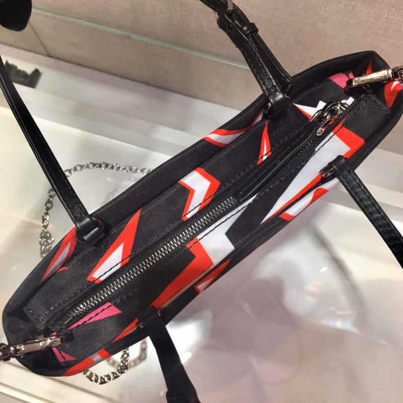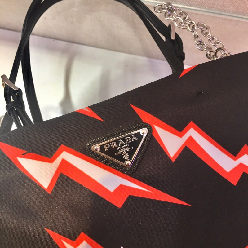 A Pop Horror hangulatú villám nyomtatás ezt a nejlon kézitáskát dupla fogantyúval és levehető fémlánc vállszíjával díszíti. A zománcozott fémháromszög logó megkülönböztető.