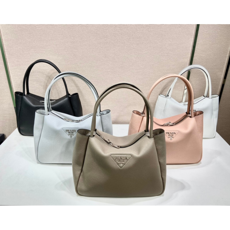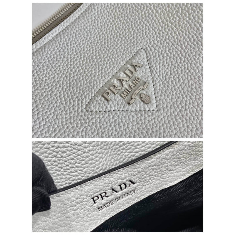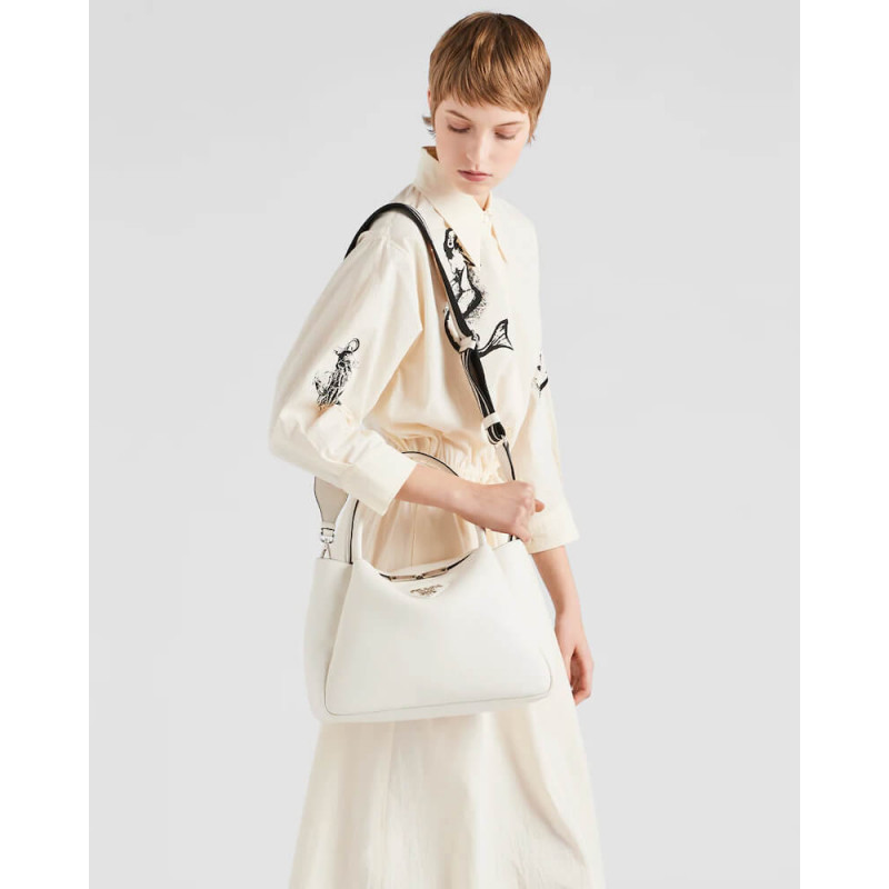 A fordított varrás hangsúlyozza ennek a kézitáskának a puha, lekerekített sziluettjét, sokoldalú, leválasztható, szövött szalag vállszíjával, amely kontrasztos színű logót tartalmaz. A tartozékot a háromszög új értelmezésével díszítik, amelyet a középpontjában a Prada fém betűkkel ellátott logóval varrnak. Br]] levehető, állítható 100 cm-es bőr vállszíj