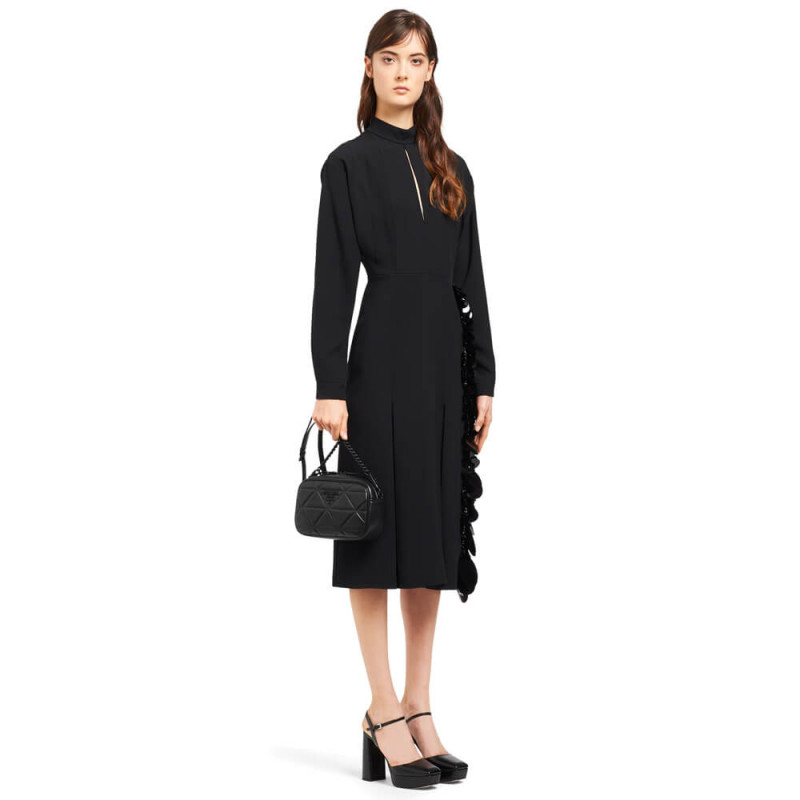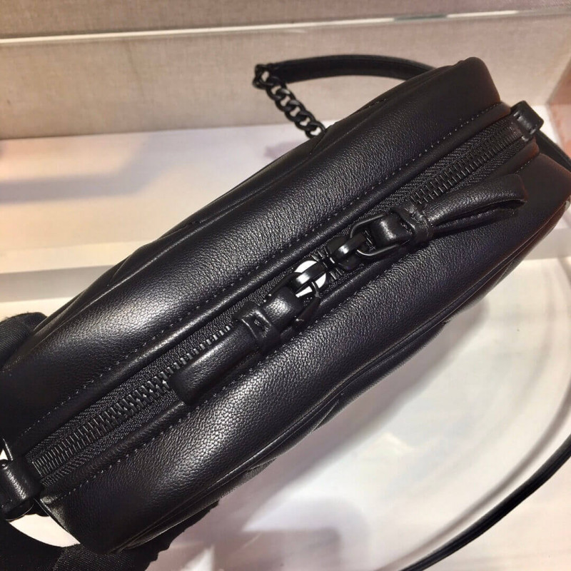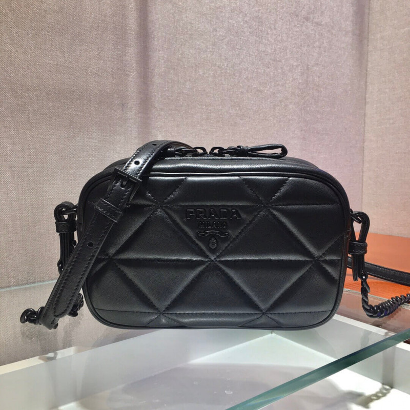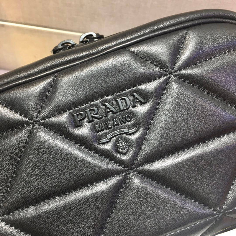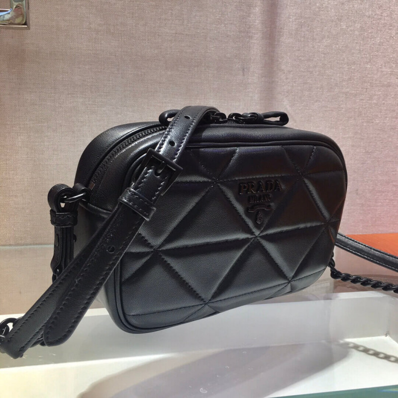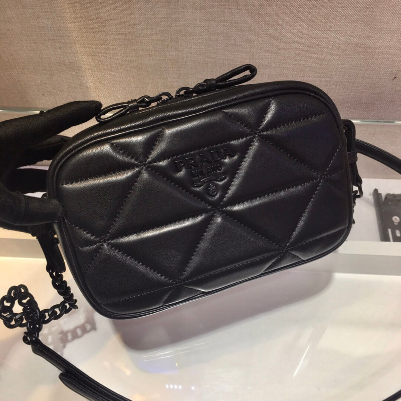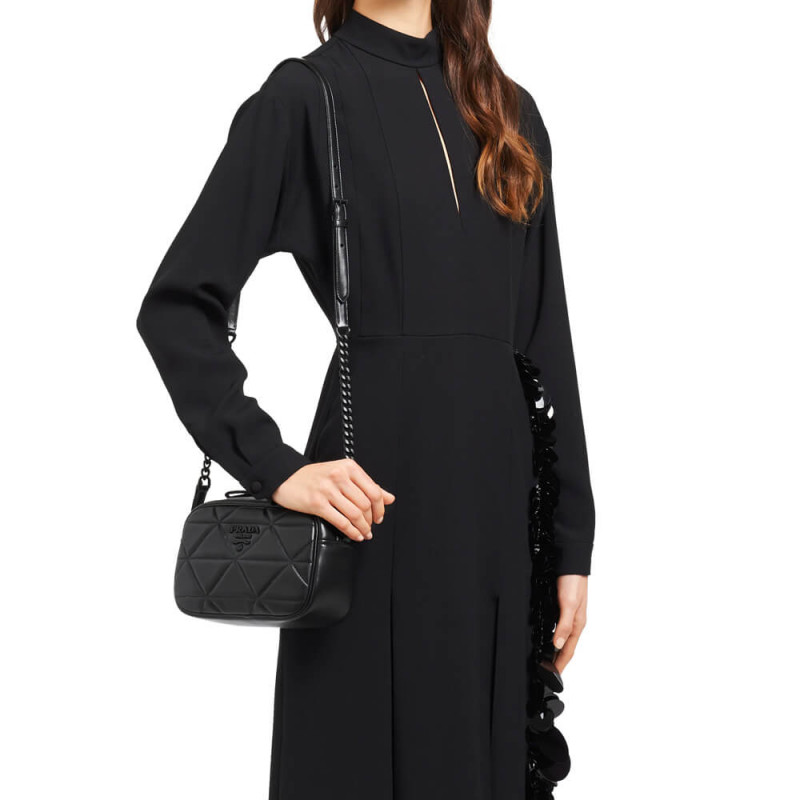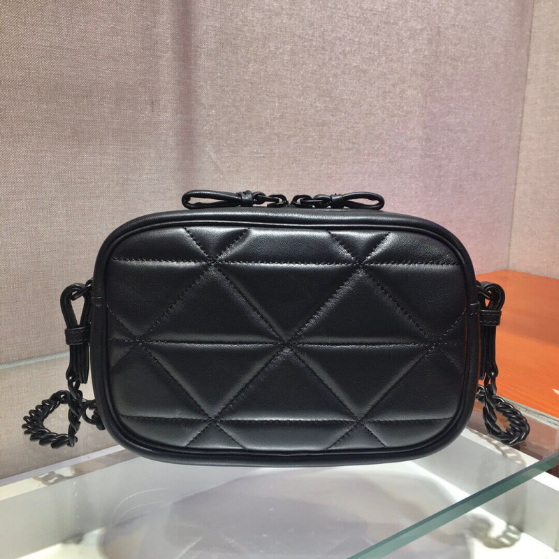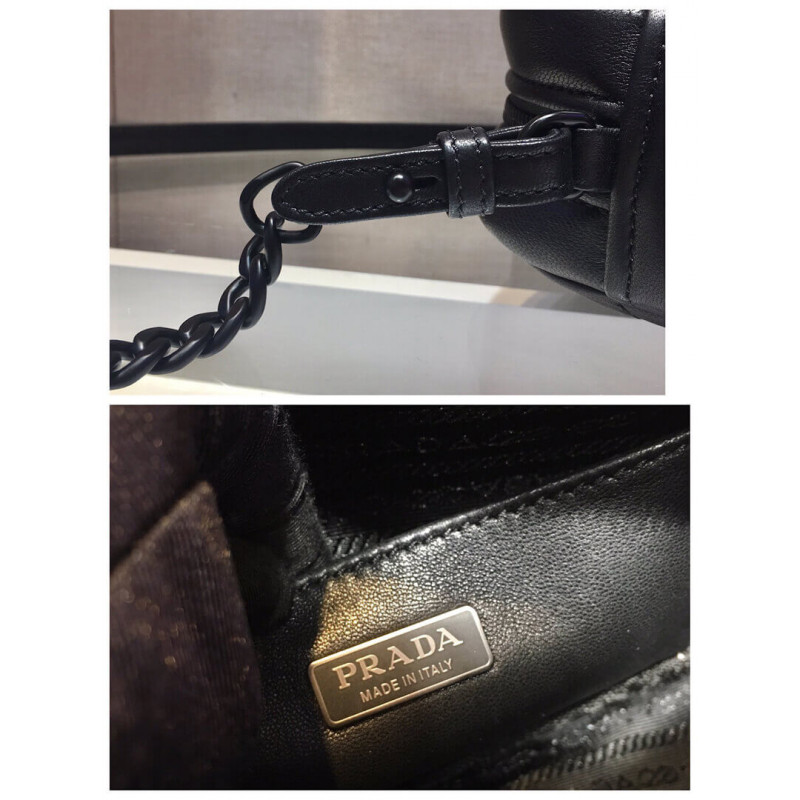 A steppelt Nappa bőr romantikus érintést ad ennek a válltáskának a kialakításához. A tartozékot fém logóval díszítik.]] Prada logo nylon bélés