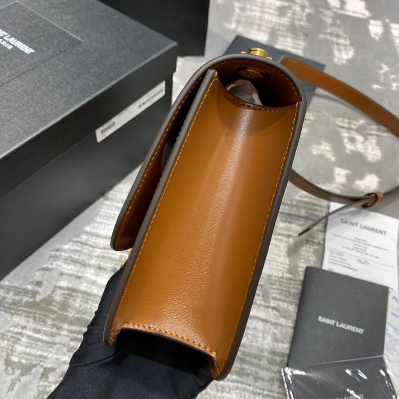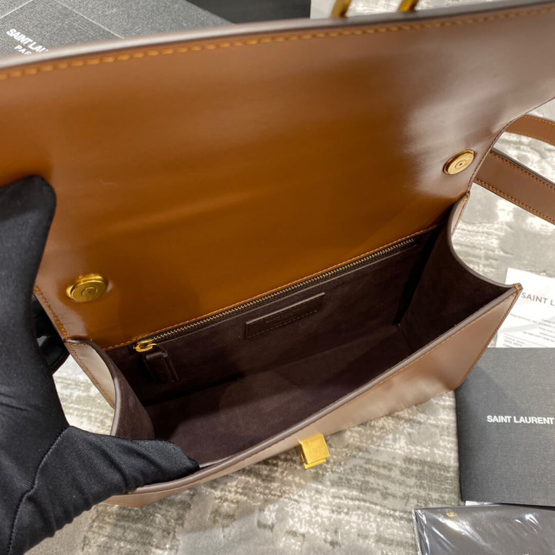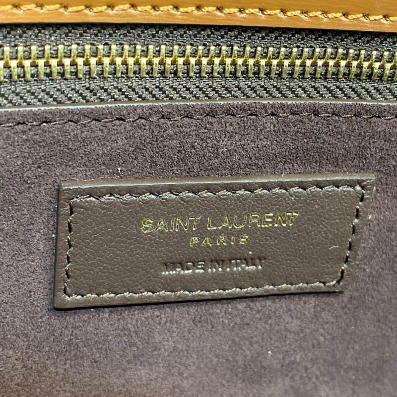 Táska kontrasztos burkolatokkal és egy Yves Saint Laurent Párizsban gravírozott négyzet alakú klip rögzítésével díszített elülső szárnymal, amely állítható vállszíjat tartalmaz. Suede bélés