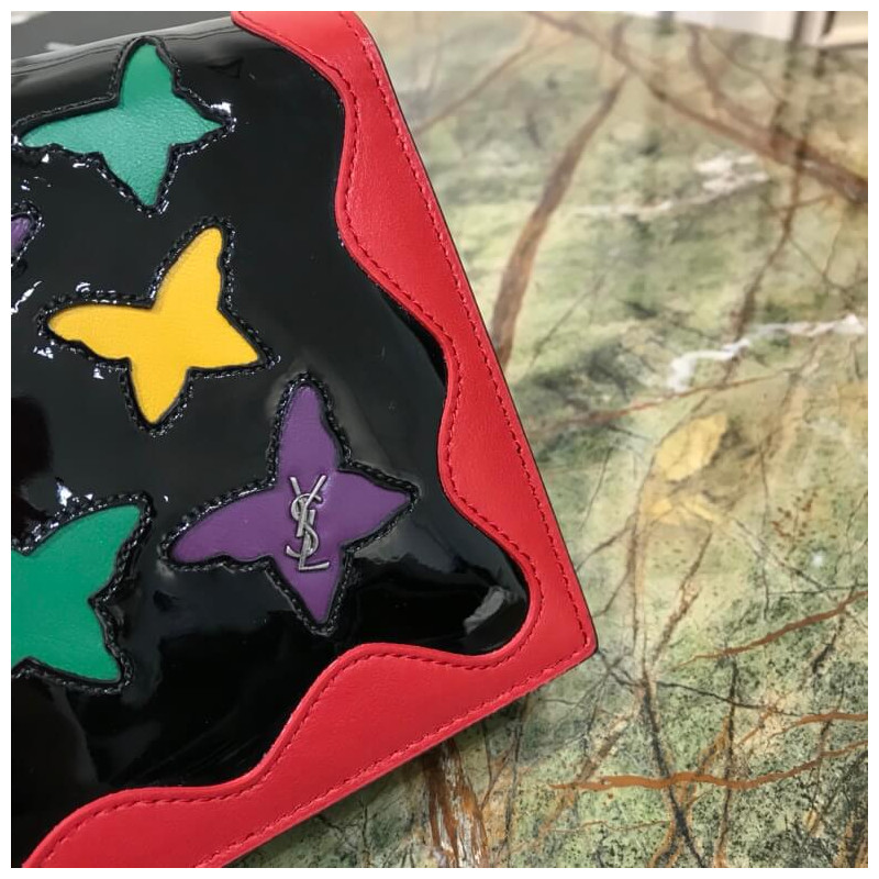 pillangó betétekkel díszítve. BR]] A belső tér 2 számla rekeszével, 1 cipzáras érmék zsebével, 2 csúszós zsebével és 20 kártyahelyekkel rendelkezik.
