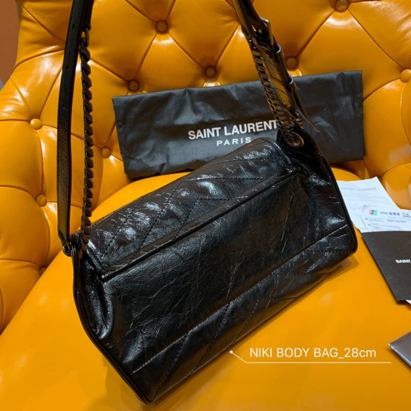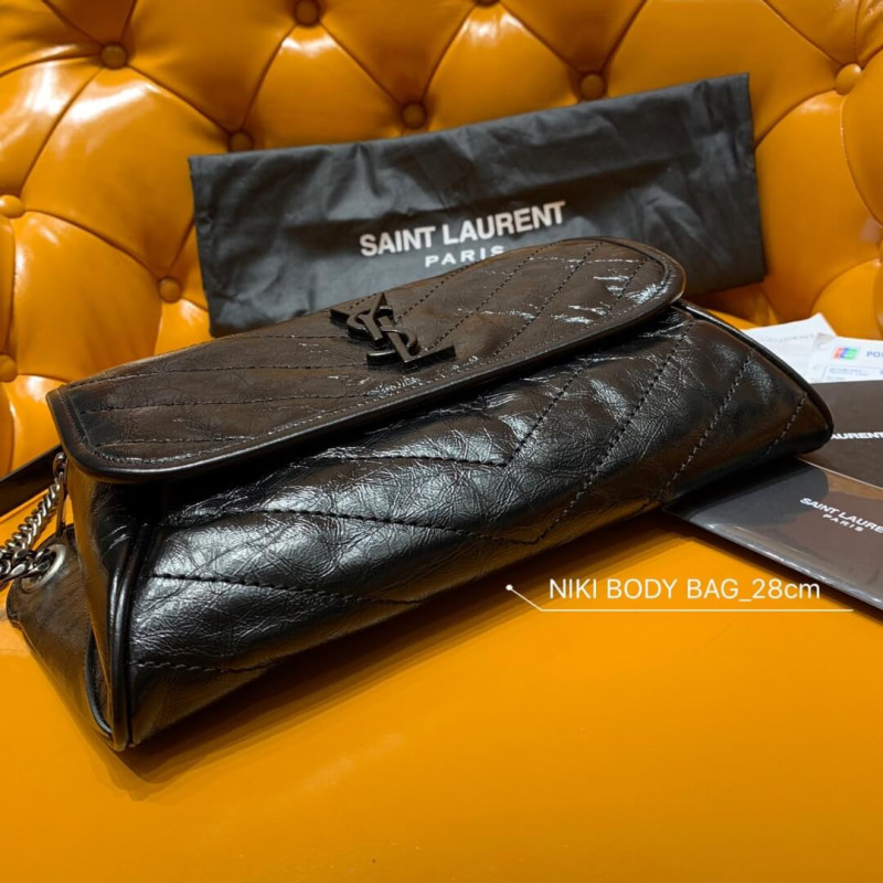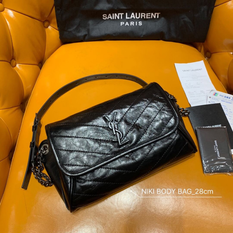 Saint Laurent monogram táska szárnyas, bőrrel borított YSL kezdőbetűivel díszítve, és quilted túltermeléssel, bőrrel erősített vállszíjjal. Régtelenített ezüst tónusú hardver