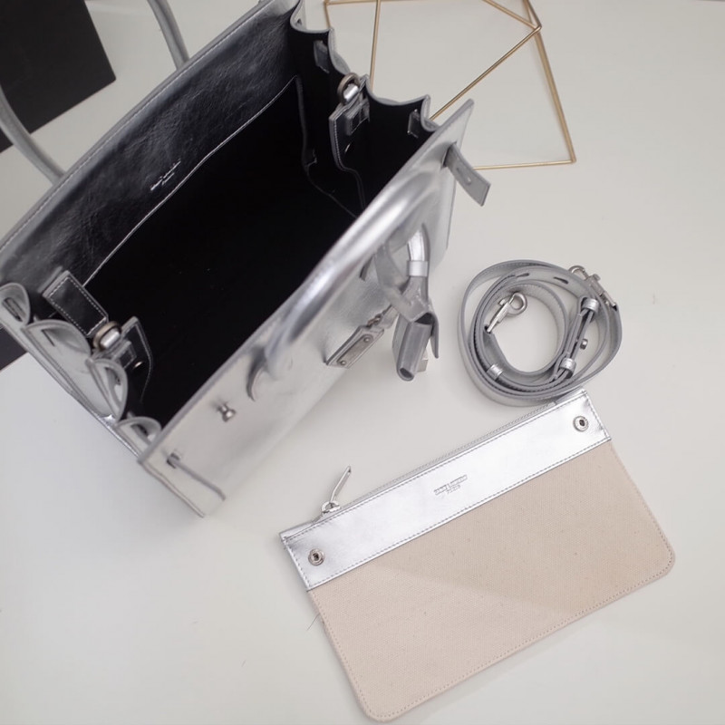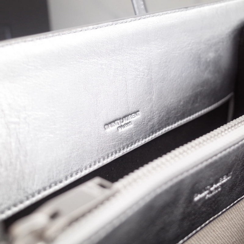 Signature Saint Laurent táska puha felépítéssel, csöves fogantyúk, harmonika oldalak, kompressziós hevederek fülekkel, dombornyomott Saint Laurent aláírás és eltávolítható, állítható vállszíj.