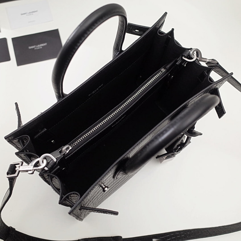 Signature Saint Laurent táska puha felépítéssel, cső alakú fogantyúk, harmonika oldalak, kompressziós hevederek fülekkel, dombornyomott Saint Laurent aláírás és eltávolítható, állítható vállszíj.