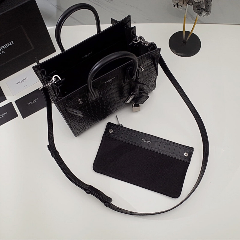 Kiválasztható bőrszíj Saint Laurent gravírozott fémlemez és a léhbe burkolt lakatba került. Bőr- és vászon zip tasak