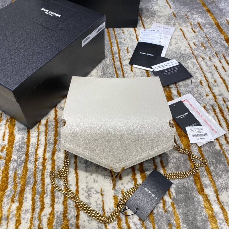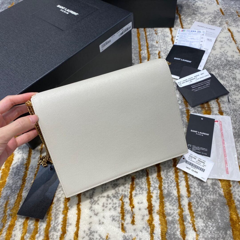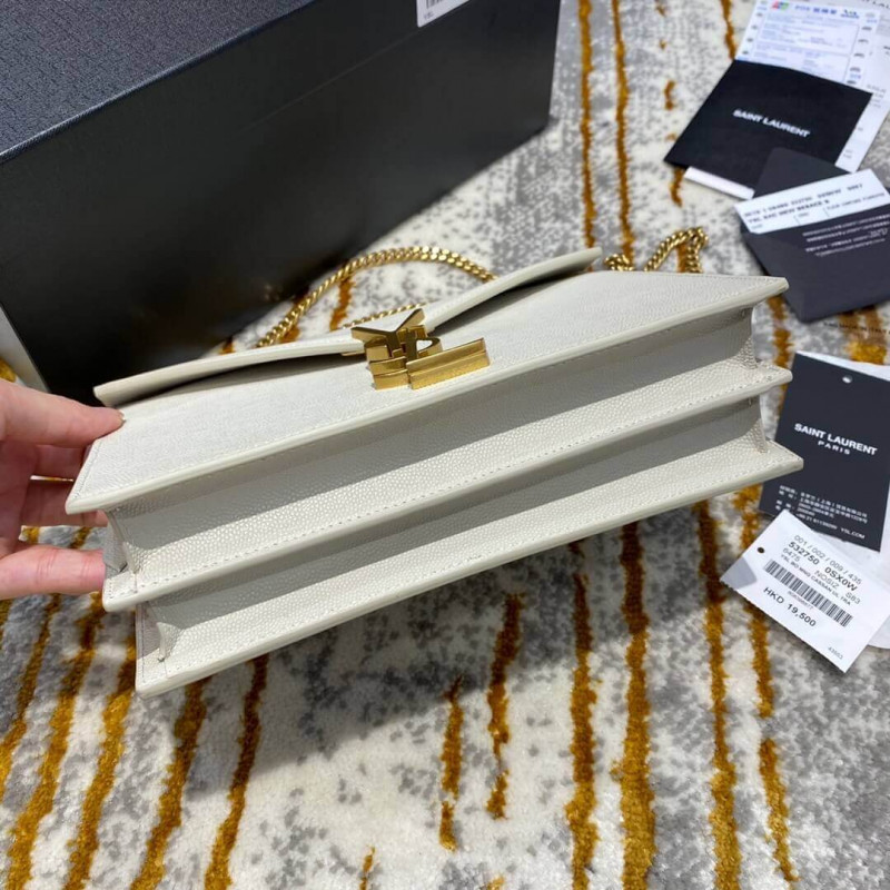 Saint Laurent monogram táska, elülső szárnyakkal és oldalán csapok, két rekesz, egy lapos zseb elõtt, elforgató YSL -rögzítõvel és kettős járdaszegély -lánccal.