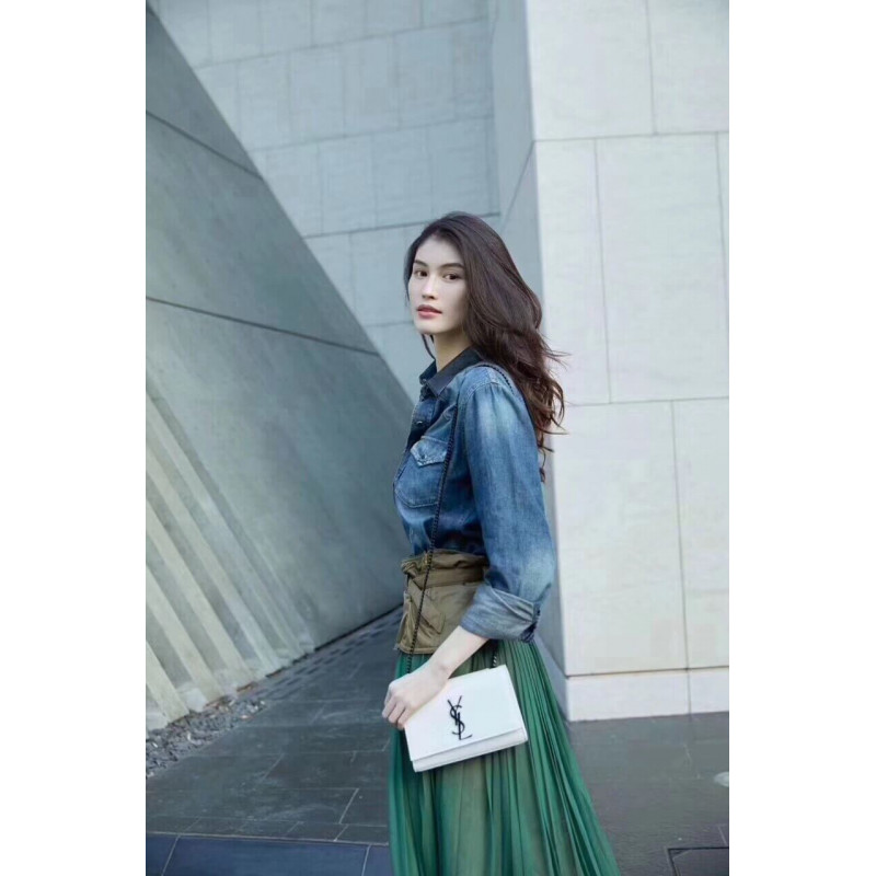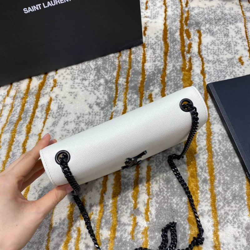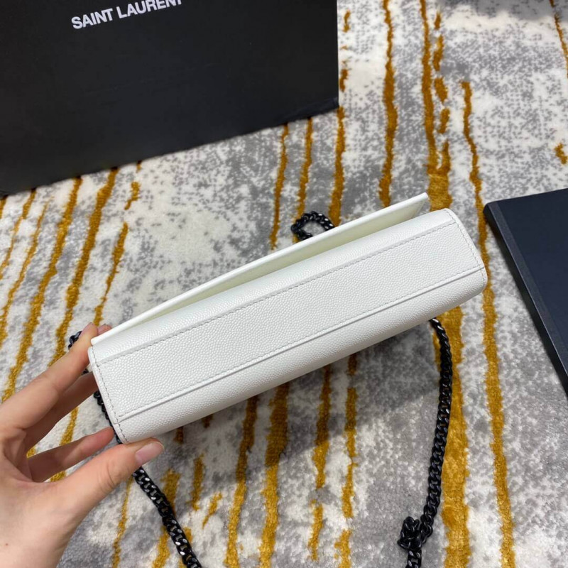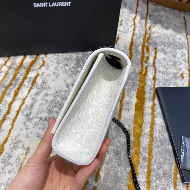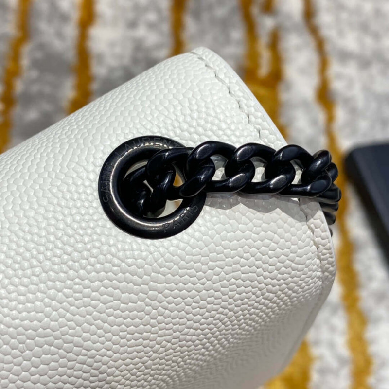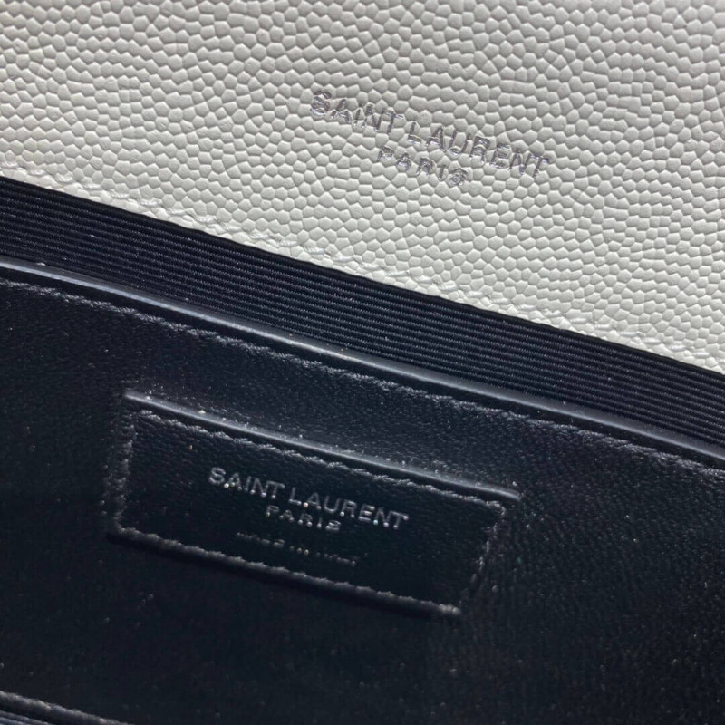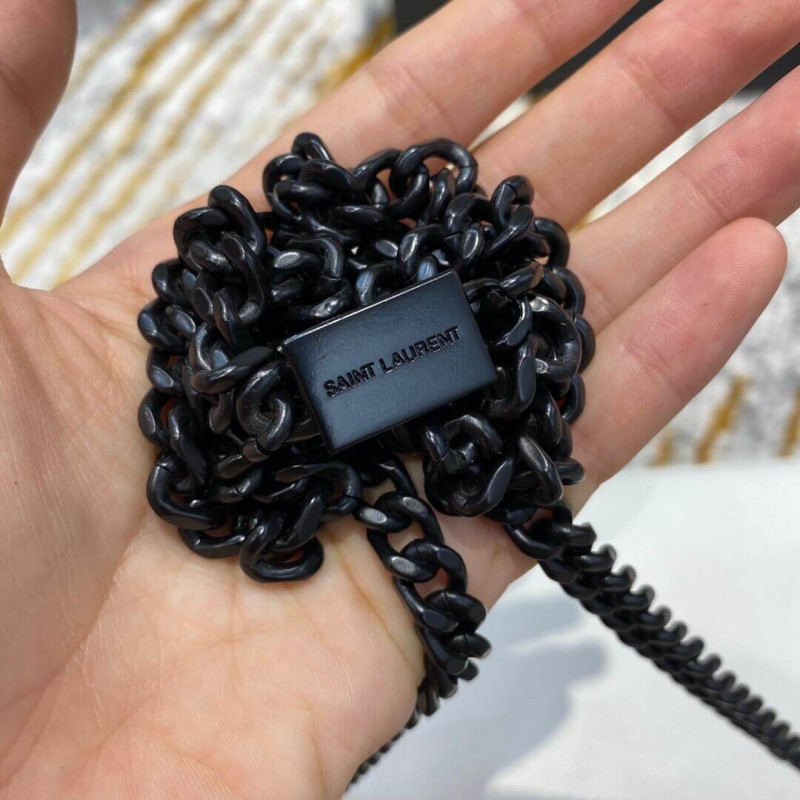 Saint Laurent monogram válltáska, amelyet egy járdaszárral és átlapoló fém YSL kezdőbetűkkel díszítettek.