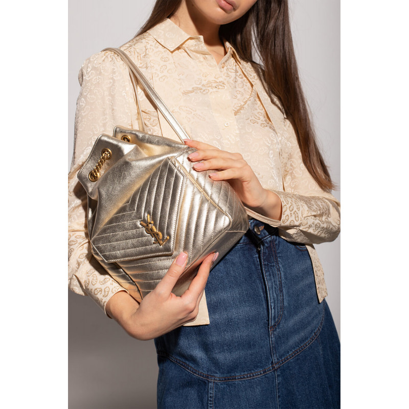 Saint Laurent monogram hátizsák Y-quilted túlzott elrendezéssel, egy elülső zsebével, mágneses fedéllel, átlapolt fém YSL kezdőbetűkkel és állítható bőr vállszíjakkal díszítve.
