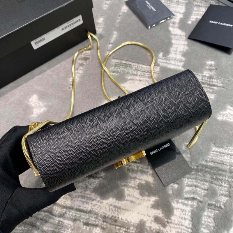 Saint Laurent Monogram doboz táska fém YSL kezdőbetűvel díszített szárnyas és négyzet alakú omega-láncú vállszíjat tartalmazó bojt.